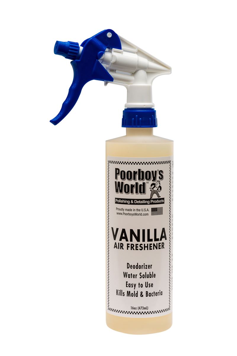 Poorboys World Vanilla Air Freshener is a great way to freshen up your cars interior. These air fresheners are perfect for any car care enthusiasts or professional detailers who want a nice smelling scent - not an overpowering odour. This water-soluble spray fragrance will freshen up stale air and will leave your car with a great smelling interior.. Fantastic Vanilla Scent. Deodouriser. Kills mold and bacteria. Water Soluble. .