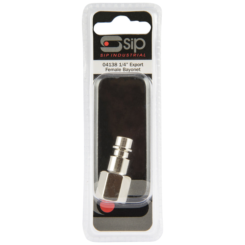 The SIP 1/4" Universal Female Bayonet Adaptor is a high-quality and hard-wearing quick-release coupler designed to allow a range of couplings to go into the same main machine body, including parts from Germany, the United States, Switzerland and Italy.It allows quick and easy connection and disconnection of compressed air equipment including air tools, compressors and air hoses. Caters for flow rates up to 1000ltr/min.This adaptor is ideal for home and trade use to professional and industrial applications.• Heavy-duty 1/4" universal female bayonet adaptor• Manufactured from zinc-plated steel with Nitrile sealing• Robust design caters for flow rates up to max. 1000ltr/min• Ideal for a wide range of industrial applications• Allows couplings from various export markets• Includes German, US, Swiss and Italian parts
