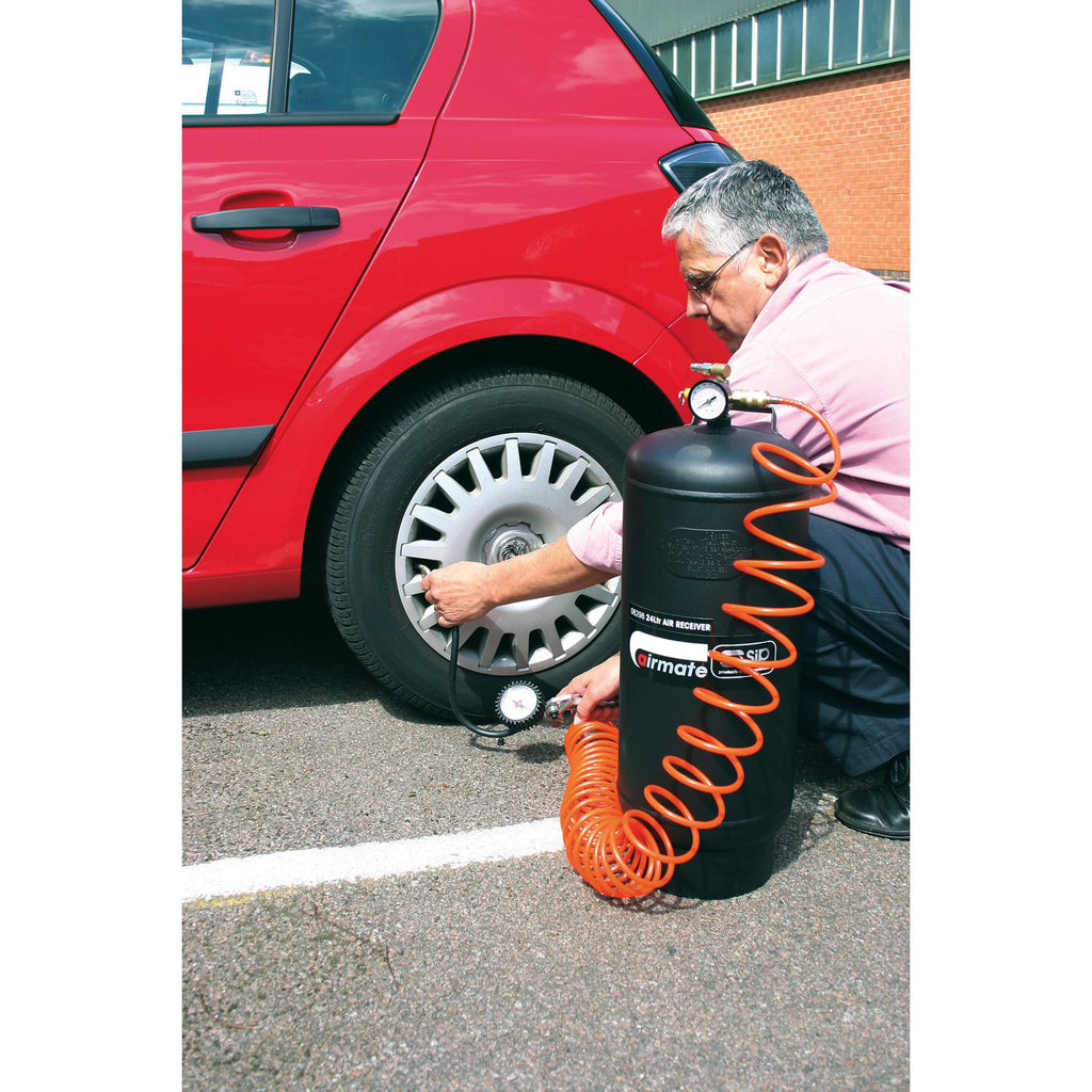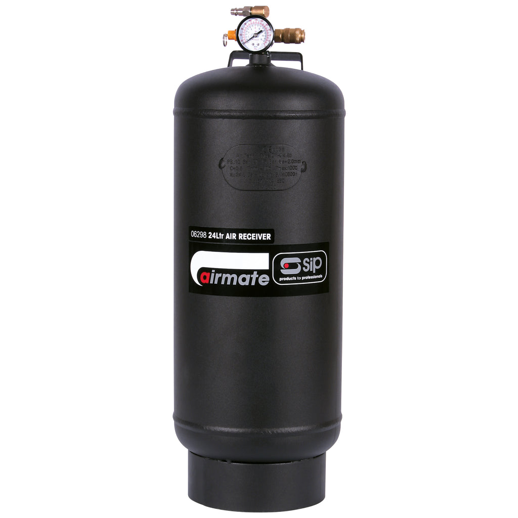 The SIP 24ltr Portable Air Receiver is designed with a vertical space-saving receiver tank that is also lightweight, ensuring that portable compressed air is available on-the-go in mobile applications or environments where using a compressor is not possible.Delivering 116psi (8bar) max. pressure, this portable and easy-to-position receiver is perfect for a variety of common compressor tasks.This includes applications such as tyre inflation, cleaning, spraying and more.• 116psi (8bar) max. pressure for various tasks• 24ltr compact, portable, and space-saving receiver• Vertical tank design for easy storage and portability• Offers a convenient and portable supply of quality air• Ideal for when using an air compressor is not possible• Integrated pressure gauge and air regulator• SIP 2-Year Standard Silver Warranty