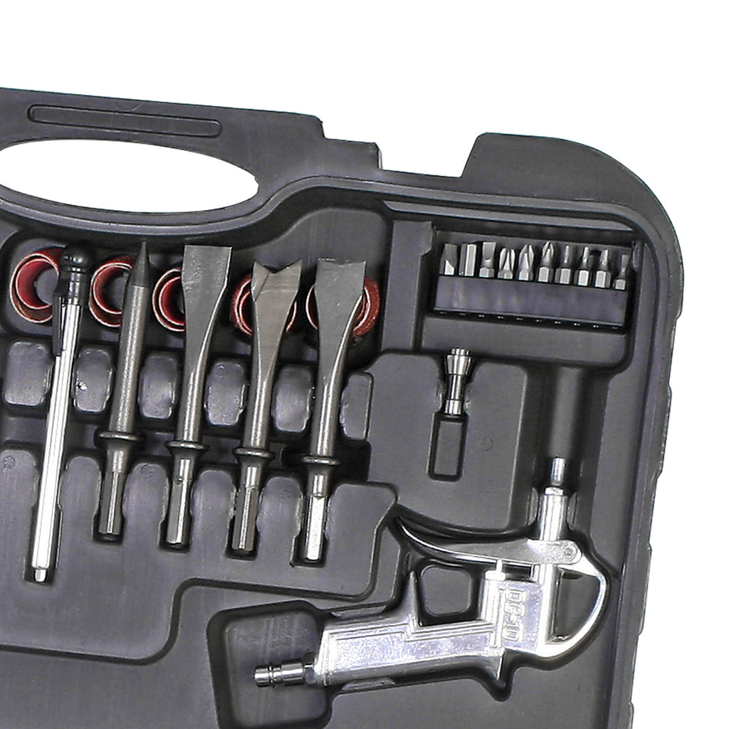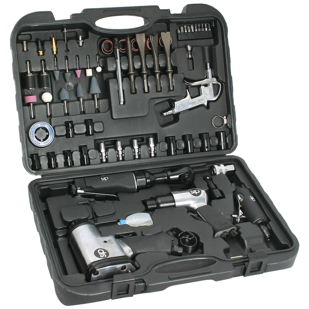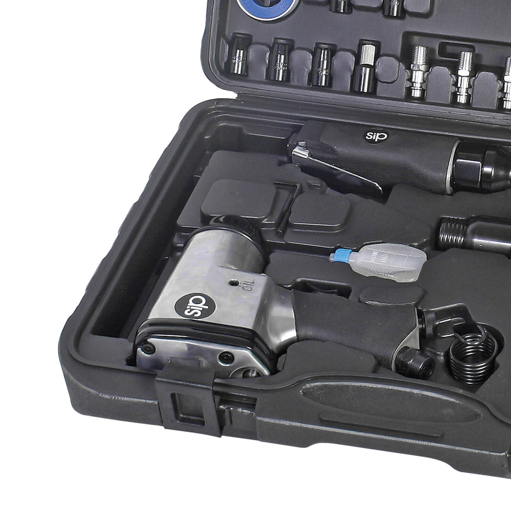 The SIP 73pc Air Tool Kit is a comprehensive kit that features four heavy-duty SIP Air Tools and a range of accessories and consumables that perfectly complement them, ensuring that the user has everything required to get the job done in a range of applications in garage or workshop environments.The first of these tools is an SIP 1/2" Air Impact Wrench which boasts 312Nm (230ft/lb) torque and 7000rpm no-load speed, completed with 8x 1/2" sockets, 9/16", 7/16", 5/8", 1/2" and more, plus 3" extension. Perfect for quick turning of bolts and fastenings.The SIP 3/8" Reversible Air Ratchet offers easy work on engines, spark plugs, pumps, bodywork, radiators and more, boasting 68NM (50ft/lb) torque and 160rpm no-load speed. Completed with 3/8" and 1/2" drive socket adaptors, 4 sockets (8mm, 9mm, 5/16" and 3/8"), 3/8" screwdriver and 10 common screw bits.The SIP Air Die Grinder is perfect for grinding, sanding and polishing applications, with a 22,000rpm no-load speed offering high efficiency. 10 grindstones, a 3/8" collet, 1" and 3/4" sanding drums, 10 sanding sleeves and 2 wrenches complete this subset.Finally, a 4500bpm SIP 150mm Air Hammer is perfect for cutting out rivets and other automotive repair applications. Supplied with 4 chisel bits.A blow gun, 5 nozzles, 4 bayonets, pressure gauge, hex key, PTFE tape, 1/4" line coupler and jubilee clip complete the 73pc kit. All of these tools, consumables and accessories are supplied in a heavy-duty blow-moulded storage carry case.• 1/2" Air Impact Wrench; 312Nm (230ft/lb) torque and 7000rpm no-load speed with 8 1/2" sockets (9/16", 7/16", 5/8", and 1/2") and 3" extension• 3/8" Reversible Air Ratchet; 68Nm (50ft/lb) torque and 160rpm no-load speed with 3/8" and 1/2" drive socket adaptors, 4 sockets (8mm, 9mm, 5/16" and 3/8"), 3/8" screwdriver, and 10 common screw bits• Air Die Grinder; 22,000rpm no-load speed with 10 grindstones, 3/8" collet, 1" and 3/4" sanding drums, 10 sanding sleeves, and 2 wrenches• 150mm Air Hammer; 4500bpm with 4 chisel bits included• Blow gun, 5 nozzles, 4 bayonets, pressure gauge, hex key, PTFE tape, 1/4" line coupler, and jubilee clip accessories• Supplied in a heavy-duty blow-moulded storage carry case• SIP 2-Year Standard Silver Warranty