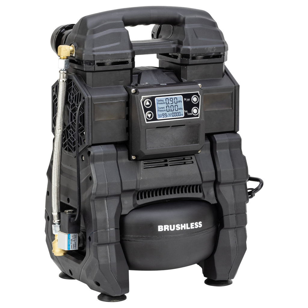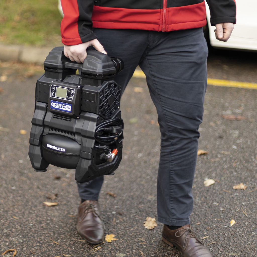 The SIP QT Battery & Mains Oilless Direct Drive Compressor is an extremely versatile and multi-functional compressor designed for applications such as nailing and stapling, airbrushing, and tyre inflation on cars, motorcycles, go-karts and more.Not only can the QT offer portable air from a lightweight, compact design using a 20v 4Ah battery - which comes included - but also from a 230v mains supply, easily switching from one to the other via an integrated AC/DC changeover switch.As well as versatile power options, the QT is packed with a spectrum of dynamic and user-friendly features that enhance this machine even further, including a crystal clear and accurate 2" LCD illuminated screen, digitally adjustable incremental air pressure, and a range of safety and durability elements, such as electric solenoid air discharge and stainless steel braided delivery pipe.Unlike other compressors on the market, the quiet system employed across the SIP QTAir Very Low Noise range does not compromise high-quality, efficient air production.• Removable and rechargeable 20v 4Ah battery• Lightweight and compact design for effortless portability• Oilless low noise pump for high-quality and clean air supply• 2" illuminated LCD screen shows target pressure and actual pressure• Digital pressure adjustment; increments of 0.2bar (to 3bar) or 0.5bar (to 9bar)• 5ltr air receiver ideal for a range of multi-function applications including nailing, stapling, airbrushing, and car, motorcycle, or go-kart tyre inflation• Strong and long life stainless steel braided flexible delivery pipe• Electric solenoid air discharge for added motor and pump protection• Slow-running twin cylinder pump for low noise and extended life cycle• AC/DC changeover switch for running on battery (DC) or mains (AC)• Fan-cooled AC power supply with increased 230v duty cycle• SIP 2-Year Standard Silver Warranty