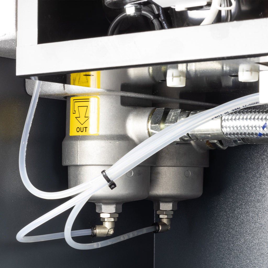 The SIP RS15-10-500BD/FF 500ltr Rotary Screw Compressor is a fully integrated workstation complete with air treatment module that includes a generously-sized refrigeration dryer with a 3°C dew point, 10µm inlet filtration and 1µm outlet filtration.Acting as an all-in-one system, this compressor has a compact and modern design that houses the air end, filters, controller and receiver in a single modular unit, providing high-quality compressed air production in a space-saving solution.Unlike other screw compressors on the market, the integrated air system provides dry and clean air to a quality standard classification 2-4-2 in accordance with ISO 8573-1.This compressor is designed for continuous use in demanding applications.Each RS15-10-500BD/FF is built to the highest standard in Italy, and then tested by experienced SIP technicians in the UK prior to dispatch for added peace-of-mind.• Fully automatic, integrated, and self-monitoring• All-in-one system; compact and modern design for easy servicing access• Electronic ETIV controller with digital display; easy-to-use and reliable• Italian-manufactured FS50 TF air end delivers high-quality constant airflow• Integrated air system provides both dry and clean air to quality standard classification 2-4-2, in accordance with ISO 8573-1• Air end, dryer, filters, controller, and receiver are in a single modular unit, providing a comprehensive space-saving solution• Dry tank technology for constant airflow and reduced corrosion• Automatic condensate discharge and status via electronic panel• 10µm inlet filtration and 1µm outlet filtration• 100% UK tested by SIP before dispatch• SIP 2-Year Standard Silver Warranty• Manufactured in Italy
