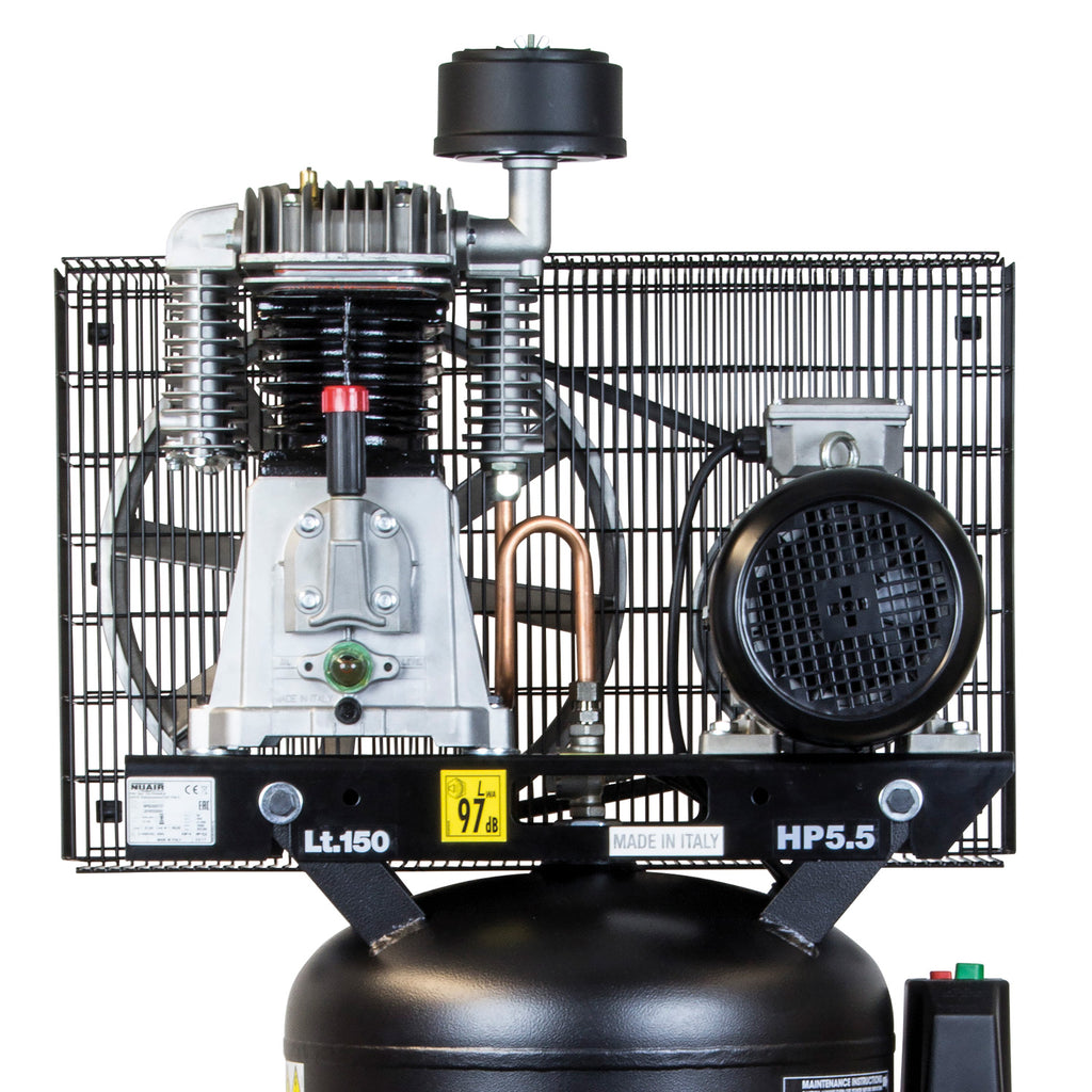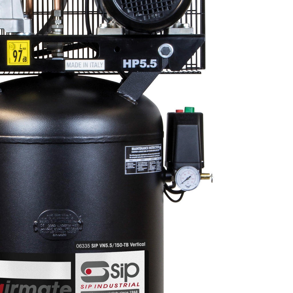 The SIP VN5.5/150-TB 150ltr Vertical Belt Drive Compressor is perfectly suited for environments where space is at a premium thanks to its vertical space-saving receiver design, meaning a reduced footprint without compromising power or durability.Utilising a combination of heavy-duty components, the VN3/150-SB provides high-quality and dryer air via superior moisture reduction. This includes finned manifolds, an oversized crankcase and an aluminium aftercooler which also helps reduce weight and increases resistance to corrosion.Ideal for workshops, industrial use and light commercial applications.• Oil-lubricated and belt-driven compressor• Space-saving vertical receiver design ideal for when floor space is limited• Heavy-duty NB5 pump for high performance in all tasks• Heavy-duty cast iron barrel for an increased service life• Finned manifolds and aluminium aftercooler for reduced moisture; aluminium ensures a reduced weight and higher corrosion resistance• Oversized crankcase for improved lubrication• SIP 2-Year Standard Silver Warranty• Manufactured in Italy