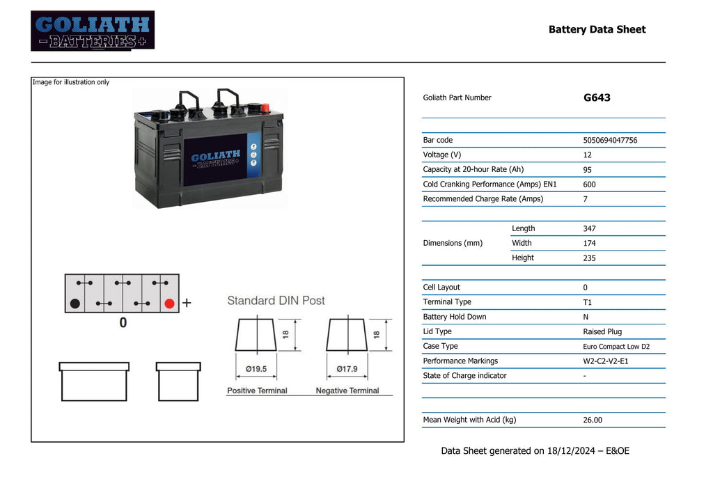Goliath G643 - 643 95Ah 600A Battery - 3 Year Warranty