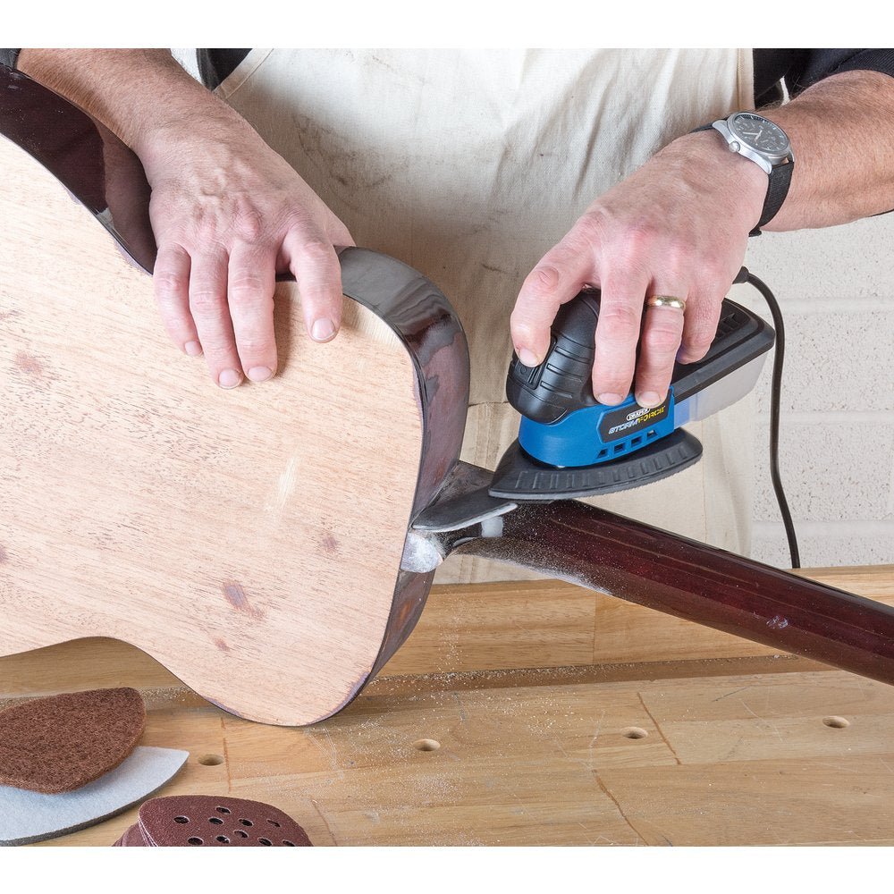 Interchangeable base and finger plates, Hook and loop base pads, Dust collection box, Supplied with 24 sanding sheets and 2m cable with BS plug.