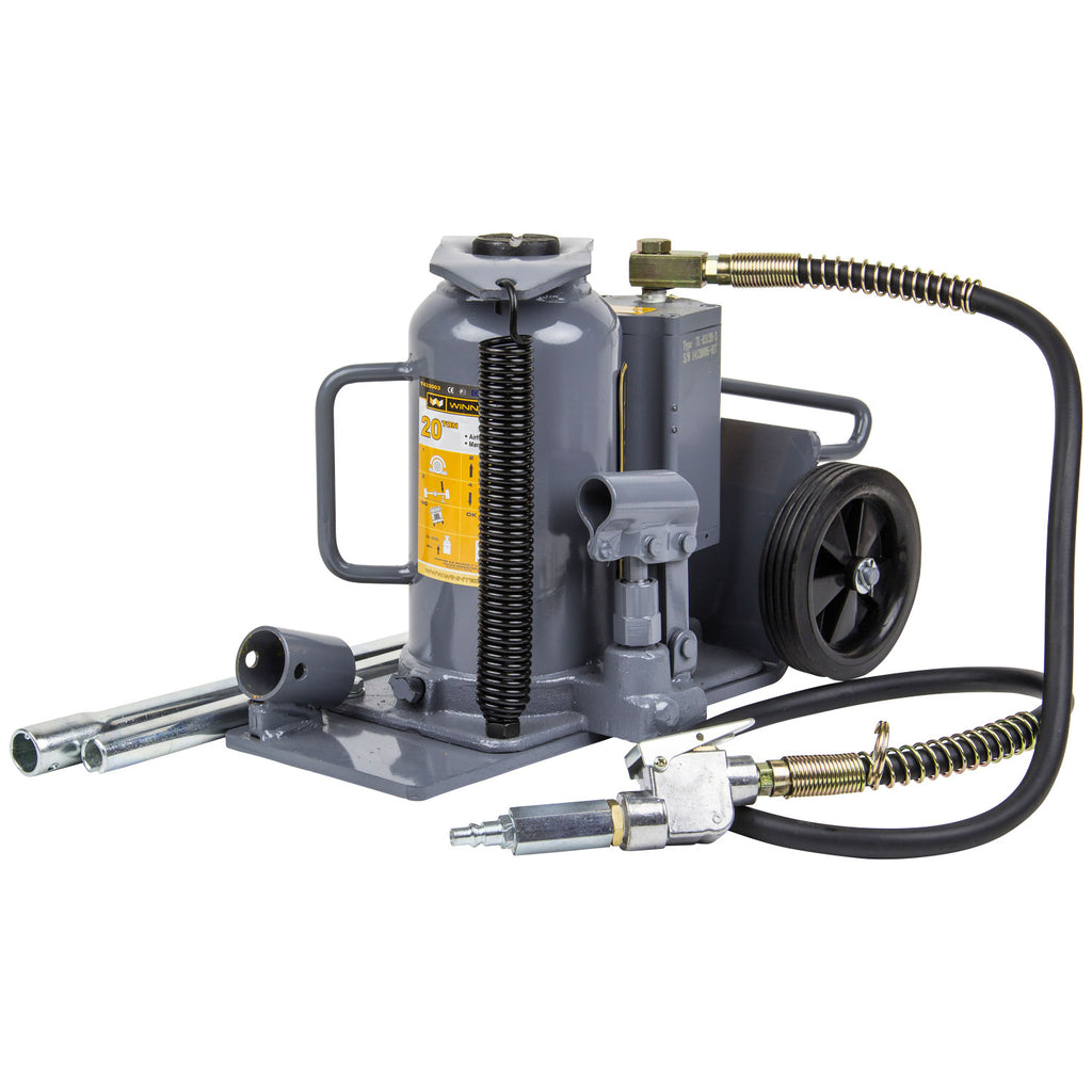The WINNTEC® from SIP 20 TON Trolley Air Bottle Jack is perfect for pushing and pressing in automotive and commercial applications in a variety of garages and workshops, offering exceptional versatility through horizontal and vertical use, with easy positioning achieved through a wide based design and wheels.Heavy-duty components, including chromed pistons and polished main ram, ensures extremely reliable and rugged performance with smaller and larger vehicles.• 20 TON maximum weight capacity• 253mm to 480mm lifting height range• 80mm screw extension for improved lifting versatility• Low-profile design perfect for performance vehicles• Heavy-duty welded wide base helps spread weight evenly• Designed for both horizontal and vertical operation• Heavy-duty aluminium air motor for rugged performance• Heat-treated cylinder wall for added durability• Durable polished ram and chromed pump pistons• Integrated overload protection for safety• Air filters help prevent contamination• Quality European design for performance• WINNTEC® from SIP 3-Year Warranty