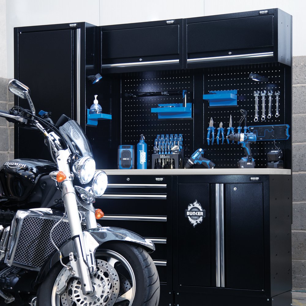 Part of the BUNKER® modular storage system. This stunningly designed combo is easily installed inside a garage or workshop to create your ideal storage system. All units are made from premium-quality steel and have a durable matt black textured industrial powder-coated finish. The floor cabinets are covered by a stylish stainless steel worktop and provide incredibly versatile storage, featuring large cupboards with fully adjustable shelves and smooth soft-close drawers lined with lush foam to protect your tools. The fixed base cabinets have adjustable feet for optimal positioning on an uneven floor. All wall cabinets have lift-up doors for convenient access, operated by whisper-quiet gas struts. For added storage, the back panels act as pegboards, and each includes one pre-cut hole for access to a power supply. Each unit has an integral lock for security and two keys are supplied. The combo comes with all the required fittings for simple installation. For your quality assurance, all BUNKER® units include a 10-year warranty. Every combo includes a free magnet of the distinctive BUNKER® logo.