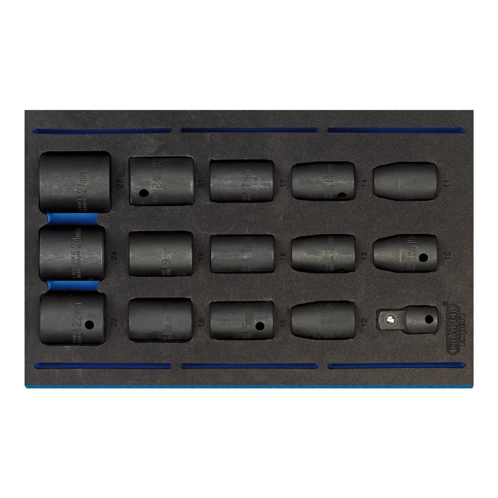 These Draper HI-TORQ® 6-point impact sockets are forged from hardened chrome molybdenum. Black phosphate finish for corrosion protection. Includes sizes 10, 11, 12, 13, 14, 15, 16, 17, 18, 19, 21, 22, 24, 27mm and a 3/8" (F) x 1/2" (M) socket converter. For use with electric or pneumatic impact wrenches with a 1/2" drive. Supplied inside an EVA drawer insert tray, 168 x 270 x 30mm. It is suitable for use in Draper and Draper Expert tool chests and other manufacturer's similar products.