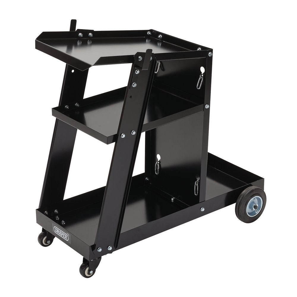This heavy-duty all-metal welding cart has three shelves for organising welding equipment and accessories. It can transport ARC and MIG welders and plasma cutters up to 440 x 257mm and a standard/large sized industrial gas bottle, secured using the 750mm fitted chain. It is designed for durability and made of thick steel with a black powder-coated finish. There are two large 125mm rear wheels and heavy-duty swivel castors at the front for easy manoeuvrability. Maximum capacity is 50kg.