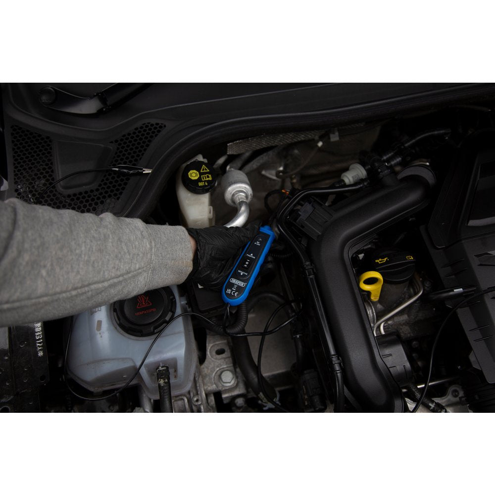 This auto probe carries out tests on DC automotive electrical circuits from 6V up to 24V quickly and efficiently. It is ideal for detecting short circuits and locating bad earths. It is also great for continuity tests and powering up components prior to fitting. The probe has an easy-to-read LED display, which illuminates green for positive voltage and red for negative. It has a long 3.45m cable to enable testing to be carried out right around the vehicle. Supplied with 2 x crocodile clips, wire probe and back probe.