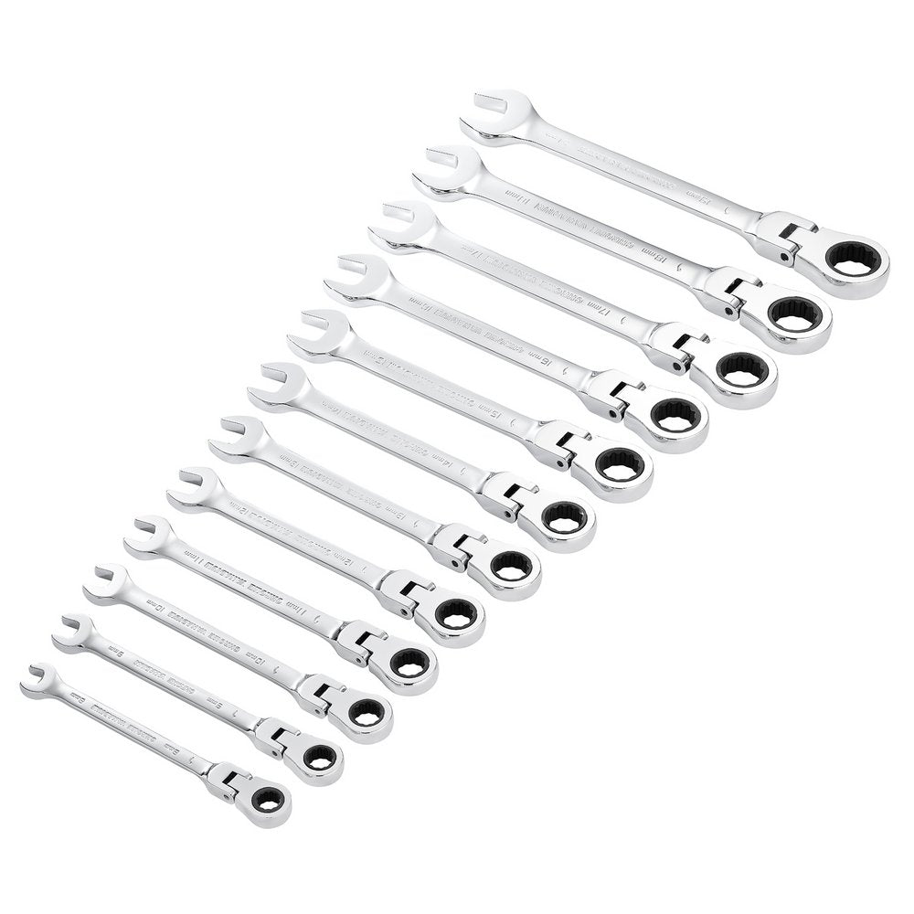 These Draper HI-TORQ® metric flexible head ratchet combination spanners are forged from chrome vanadium steel that is hardened, tempered, fully polished and mirror chrome plated for corrosion protection. The open end is offset at 15°. The 180° flex head ring end has a 90-tooth ratchet mechanism allowing 4° movement, enabling use in tight spaces. The 12-point HI-TORQ® delivers maximum leverage by transferring torque to the flats and preventing slipping or damage to the fastener. This 12-piece set contains all the popular sizes. Packed in a plastic rack.