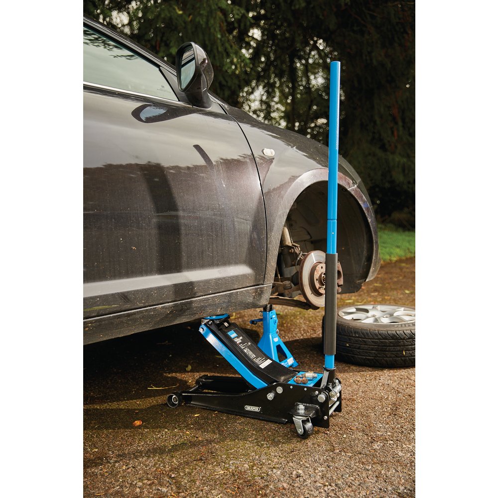 This low profile trolley jack is capable of lifting from 75-505mm and it has a capacity of 3 Tonne. It has a twin-piston quick lift facility, with eight pumps to enable it to reach maximum height efficiently. The twin spring return system ensures the jack lowers safely when not under load. It is fitted with a twin safety valve to prevent the jack from overloading. There is an integrated rubber saddle pad to prevent damage to the underside of the vehicle when in operation. There is also an EVA foam handle cover to prevent panel damage. The knurled handgrip on the end of the lifting arm enables a more secure hold when used. Fitted with hardwearing nylon wheels with rear swiveling castors, for quiet and smooth operation. These wheels also prevent damage to garage floors.