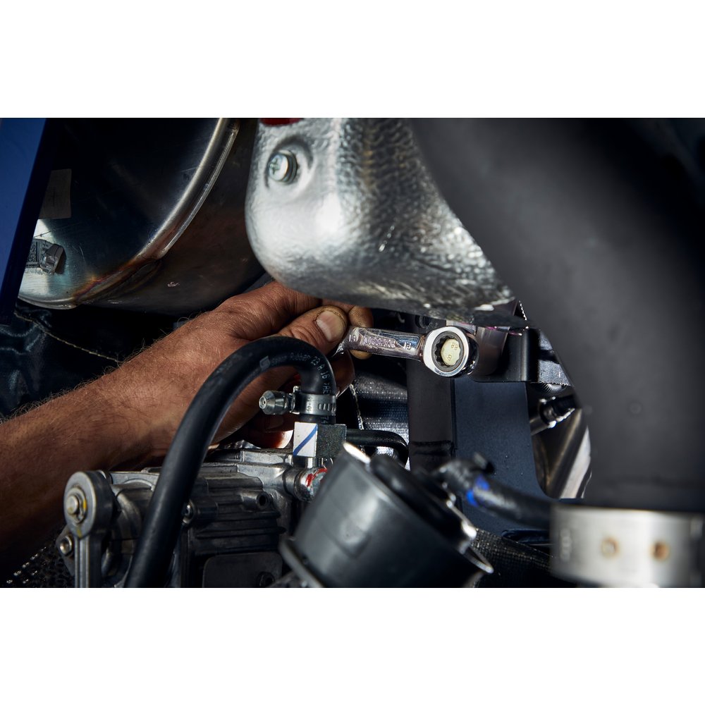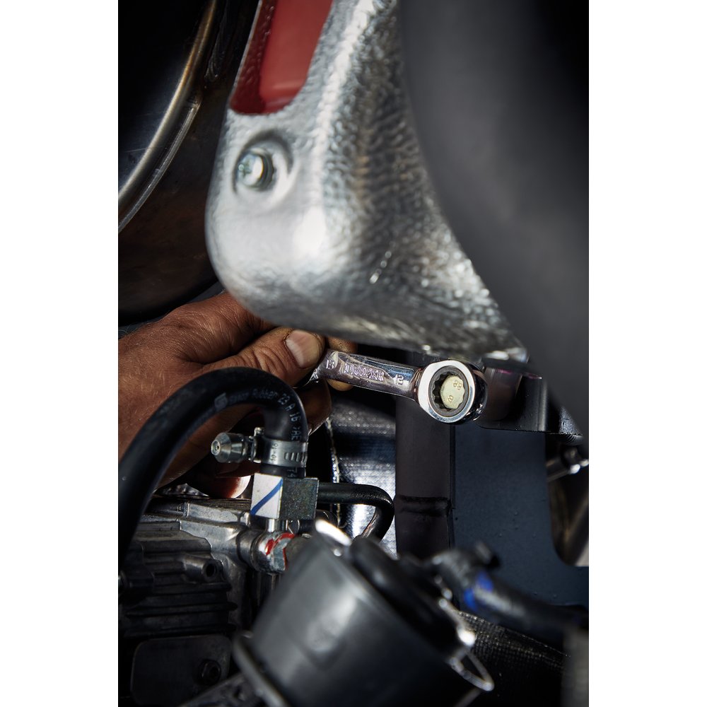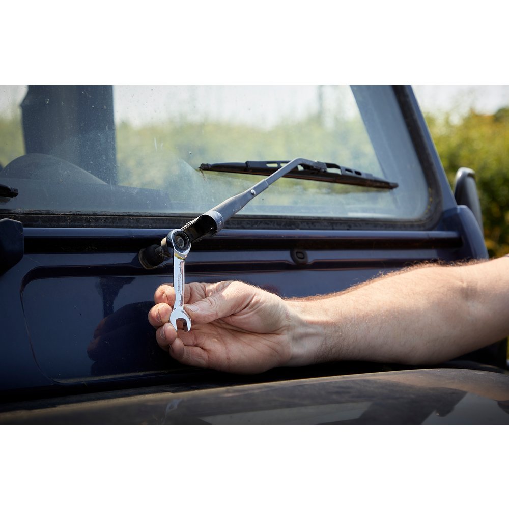 These Draper HI-TORQ® metric stubby flexible head ratchet combination spanners are forged from chrome vanadium steel that is hardened, tempered, fully polished and mirror chrome plated for corrosion protection. The open end is offset at 15°. The 180° flex head ring end has a 90-tooth ratchet mechanism allowing 4° movement, enabling use in tight spaces. The 12-point HI-TORQ® delivers maximum leverage by transferring torque to the flats and preventing slipping or damage to the fastener. This eight-piece set contains popular sizes. Supplied in a Tetron wallet.