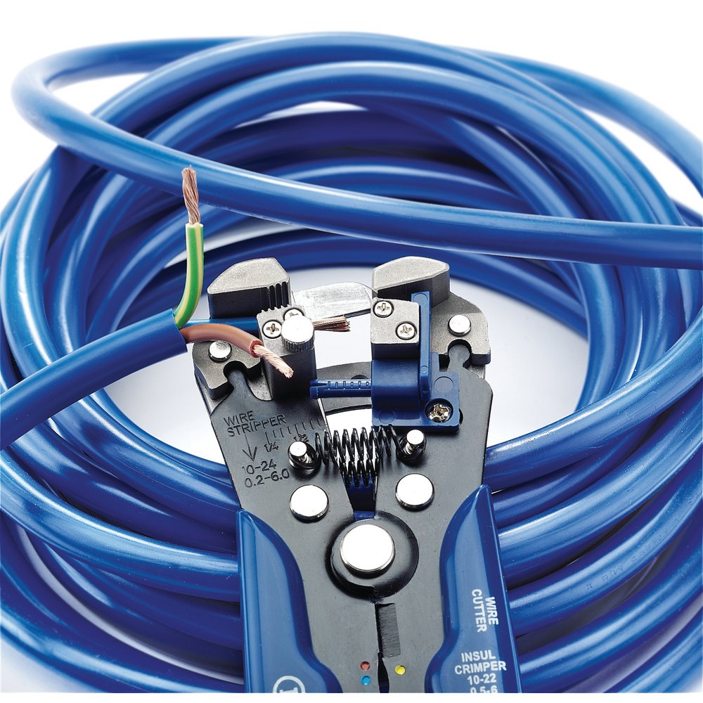 Professional or DIY use. Single motion stripping of wires/insulation and the crimping of insulated and non - insulated terminals. Wire stripping range 0.2 - 6.0mm2, crimping range 0.5 - 6mm2. Carbon steel blades, alloy steel jaws hardened and tempered, with plastic hand grips.Payment & Security