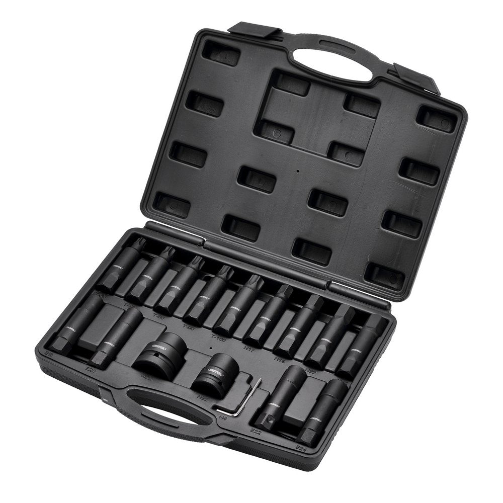 • Includes hex bits, star bits, E-sockets, impact socket adaptors and hex key