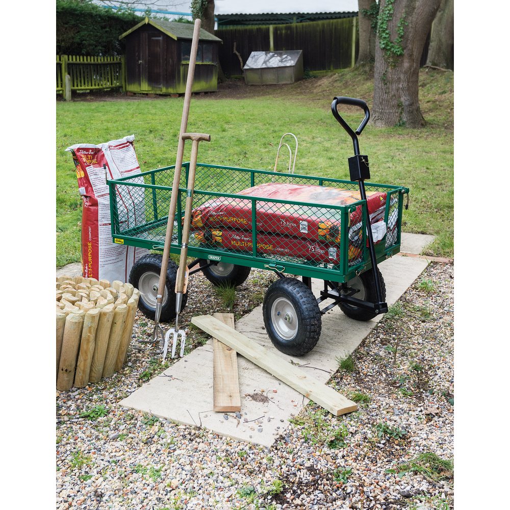 Steel fabricated cart with fold down sides, foam handle and heavy duty pneumatic wheels. The handle easily converts for towing, making light work of moving heavy material. Designed for loads up to 450kg. Ideal for use in the garden. A heavy duty waterproof liner is available separately.