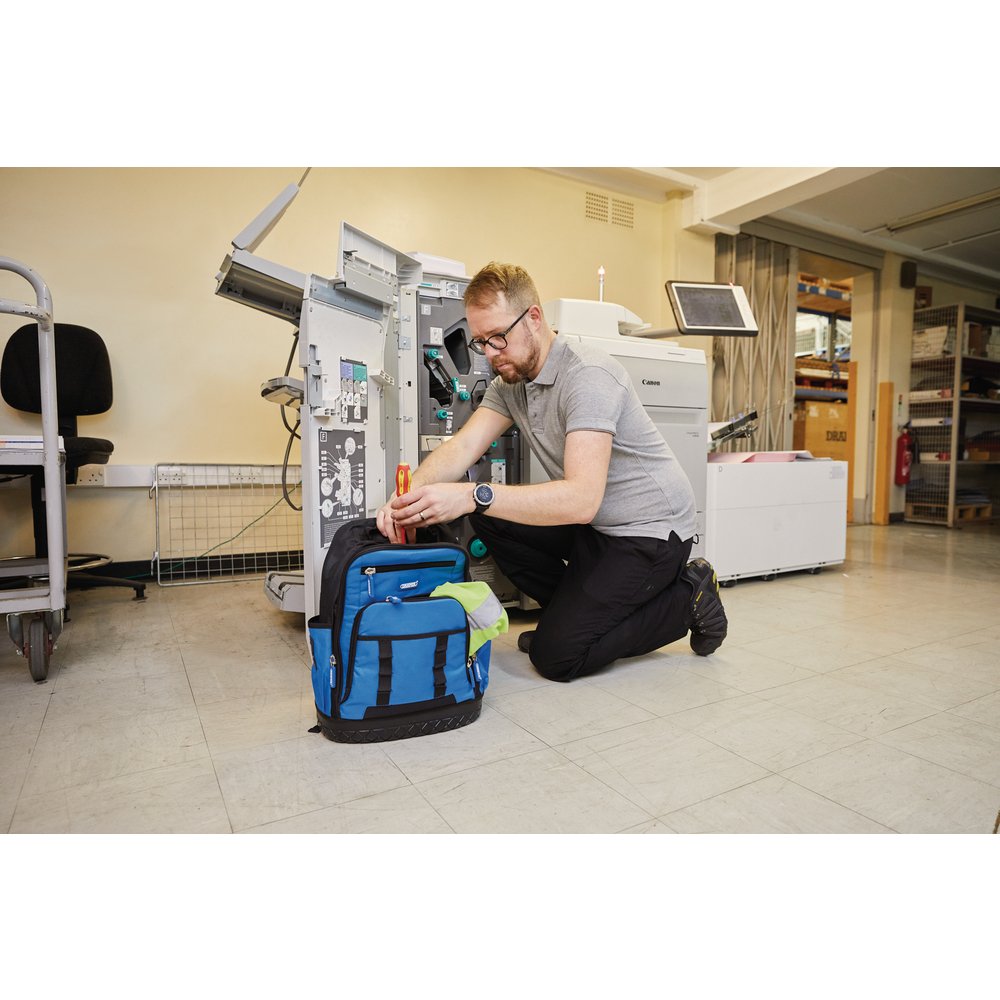 This tool backpack has been designed to meet the rigours of everyday work. Hard-wearing and durable, the backpack features reinforced padded straps for added strength, while back panels are padded for user comfort. The backpack has a rigid base and is made from water-resistant polyester. A large internal board-lined compartment has been incorporated for carrying a laptop and paperwork. There are nine internal and five external pockets, plus a card/name pocket. The backpack is ideal for transporting smaller tools for everyday use, such as spanners and screwdrivers.