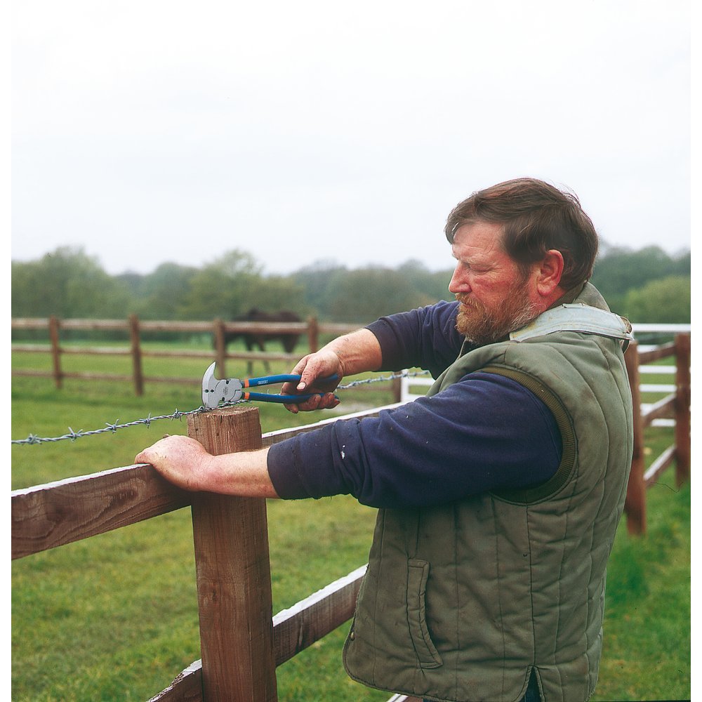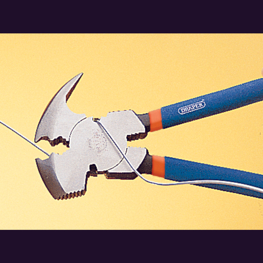 Expert Quality, manufactured from carbon steel with smoothly ground and polished head. Head incorporates a striking face; staple removing hook; pincer and clamp on top jaw; grips on inside of handles for straining and twisting wire and two shear type wire cutters. Cushion grip handles.