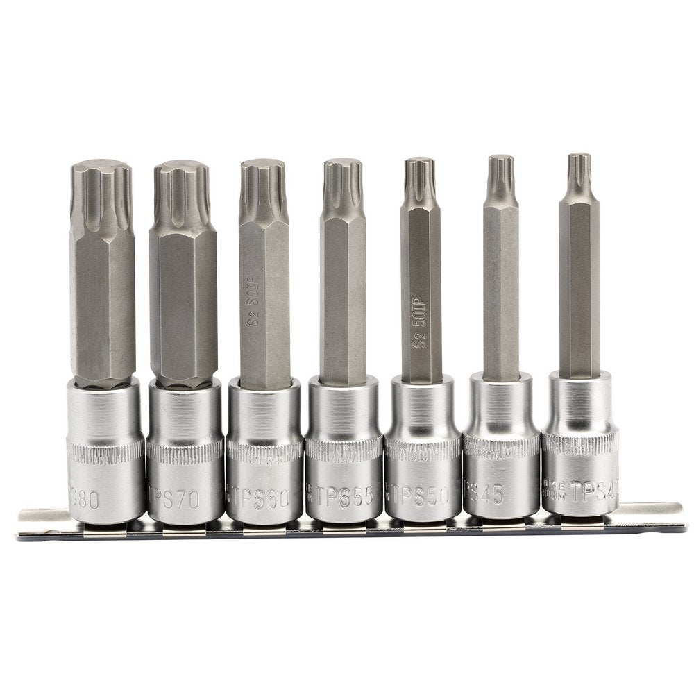 Expert Quality, 7 Draper TX - STAR® Plus socket bits, 100mm long. All socket manufactured from hardened and tempered chrome vanadium steel with sand blasted bits of S2 silicon steel. Each socket has a knurled ring for extra grip. Supplied on a steel socket retaining rail.