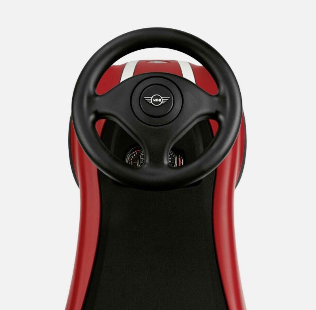 Wow your little ones will love whizzing around in the smooth-running Red & Black MINI Baby Racer. It has low noise rubber tyres and a soft, detachable seat cushion that can be washed whenever needed. The body is made from nontoxic polyethylene and can be accessorised with an optional push bar for when they inevitably wear themselves out. The classic Chili Red and White bonnet stripes give the little racer its unique MINI look. Suitable for children 18 months and over.