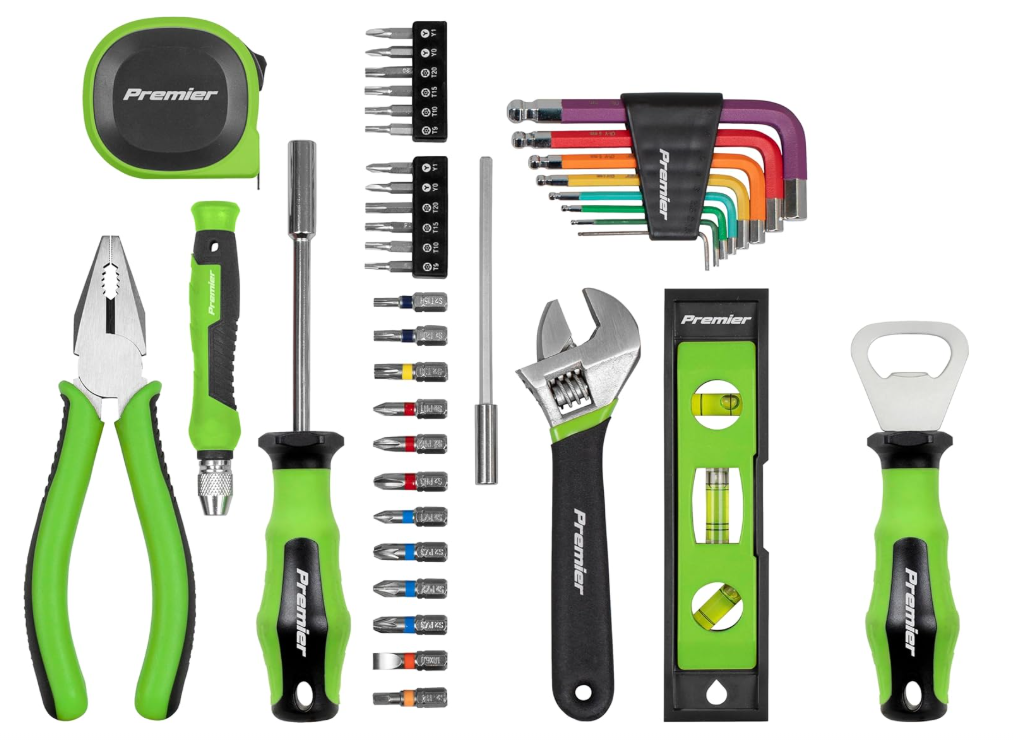 - Accessories: 150mm Combination Pliers, 150mm Adjustable Wrench, 150mm Tapedo Spirit Level, Bit Driver, Precision Bit Driver, 115mm Precision Bit Driver Extension, Tape Measure 3m x 16mm, Bottle Opener
