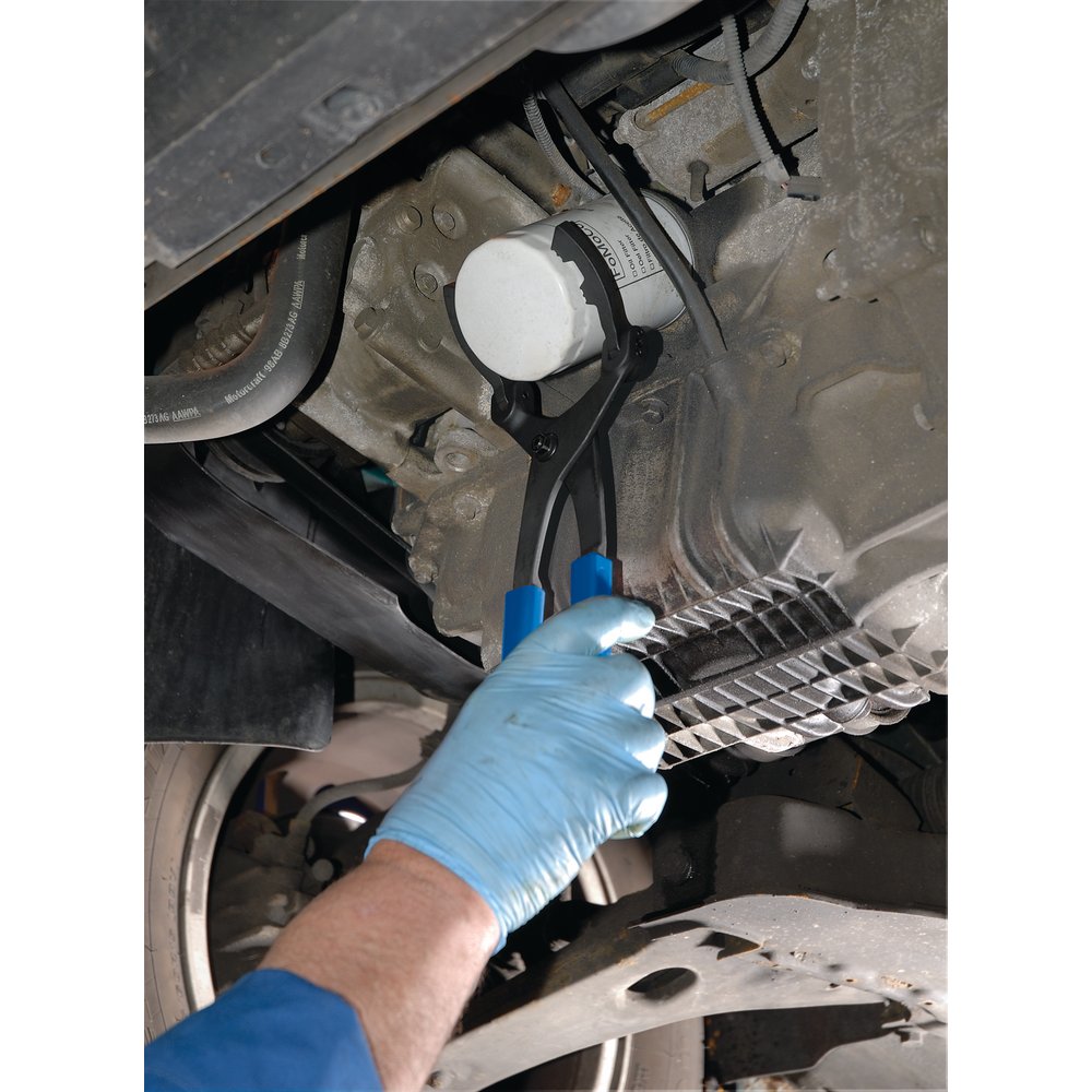 These adjustable oil filter pliers are designed to aid the easy removal of oil filters. The slip joint allows easy adjustment, with swivel gripping jaws adjusting to 30°, 60° or 90° positions to allow access to oil filters in awkward positions. The ribbed jaw design ensures a solid grip on filters during removal. Plastic-covered handles for a comfortable grip. Suitable for filters 57-120mm.