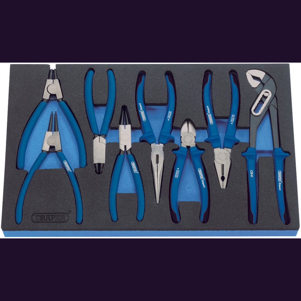 Combined pliers and circlip pliers set packed in EVA foam tray, ideal for tool cabinet arrangements or tool box storage. The pliers are manufactured from high quality steels hardened and tempered with ergonomic soft grip handles for user comfort.