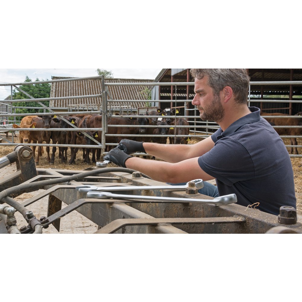 Forged from chrome vanadium steel hardened, tempered and chrome plated for corrosion protection. Polished Draper HI-TORQ® ring end offset at 15°. Jaw offset at 15°. Supplied in wall mountable plastic storage rack.