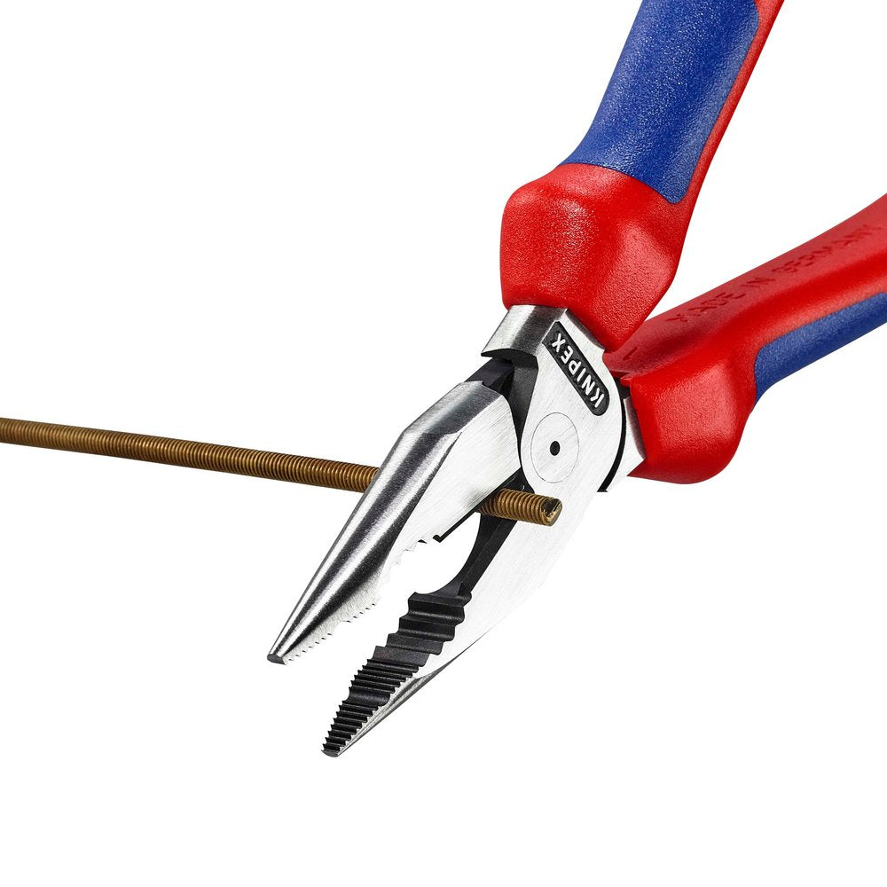 08 22 185 SB Needle-Nose Combination Pliers Powerful combination pliers with pointed jaws. For all common installation and repair work.. handy use when working in confined areas thanks to slim head design and pointed jaws (anti-twist). Milled groove in the gripping area permits small parts such as nails, pins and bolts to be held and pulled. The reliable and diverse combination pliers when out and about. Easy cutting thanks to the high leverage joint. With cutting edges for soft, medium-hard and hard wire. Long service life and stable tips. Cutting edges additionally induction-hardened, cutting edge hardness approx. 64 HRC. - Cutting capacities medium hard wire (diameter): Ø 3.8mm- Cutting capacities hard wire (diameter): Ø 3.0mm- Cutting capacity copper cable, multiple-stranded: Ø 13.0mm- Cutting capacity copper cable, multiple-stranded: 25.0mm²