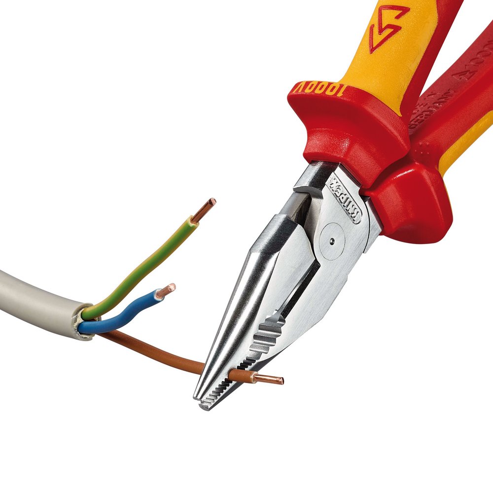 08 26 185 SB Needle-Nose Combination Pliers Powerful combination pliers with pointed jaws. For all common installation and repair work.. handy use when working in confined areas thanks to slim head design and pointed jaws (anti-twist). Milled groove in the gripping area permits small parts such as nails, pins and bolts to be held and pulled. The reliable and diverse combination pliers when out and about. Easy cutting thanks to the high leverage joint. With cutting edges for soft, medium-hard and hard wire. Long service life and stable tips. Cutting edges additionally induction-hardened, cutting edge hardness approx. 64 HRC. - Cutting capacities medium hard wire (diameter): Ø 3.8mm- Cutting capacities hard wire (diameter): Ø 3.0mm- Cutting capacity copper cable, multiple-stranded: Ø 13.0mm- Cutting capacity copper cable, multiple-stranded: 25.0mm²- VDE tested: yes