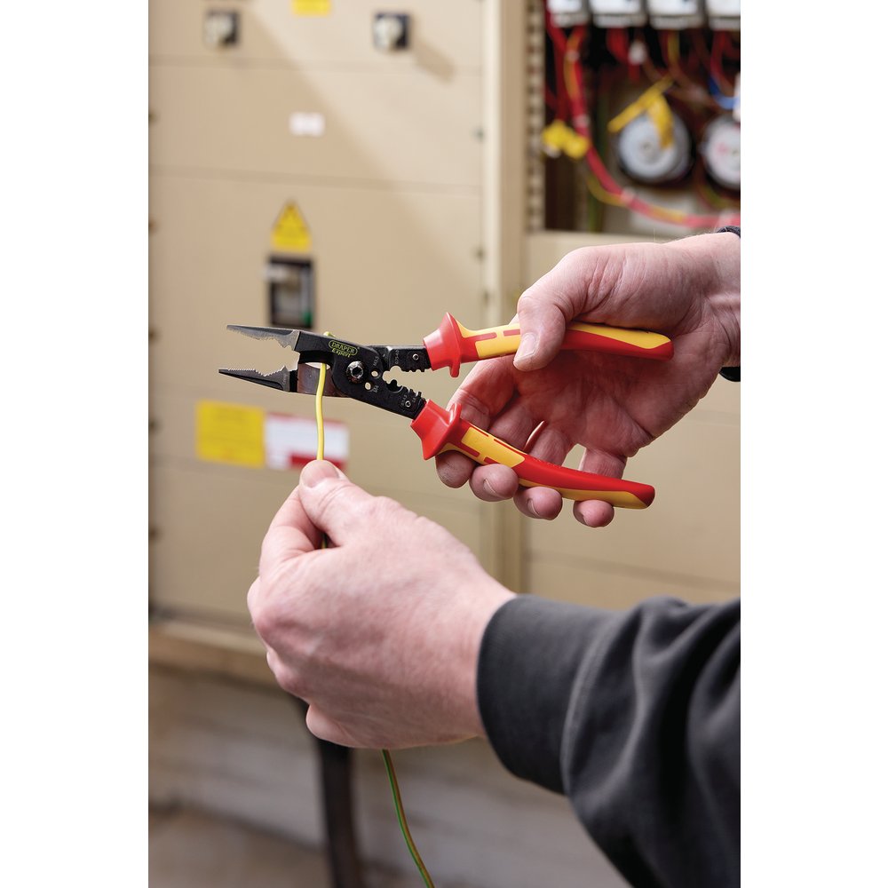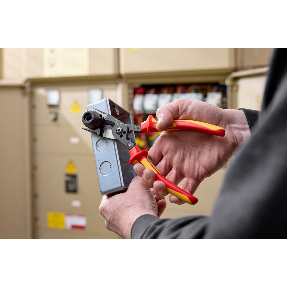 XP1000®, manufactured from premium steel forged in Germany. These convenient pliers are an all-in-1 cable cutter, 0.75-2.5mm wire stripper, long nose plier, 3.5mm pattress screw and 4.0mm conduit cover screw shear, 0.5-4.0mm terminal crimper, wire bending anvil, water pump plier and conduit hole deburr. The two part bi-material ergonomic soft grip handle allows maximum grip and user comfort. Tested to 10,000V, these pliers are suitable for working on live circuits of 1,000V AC and 1,500V DC.