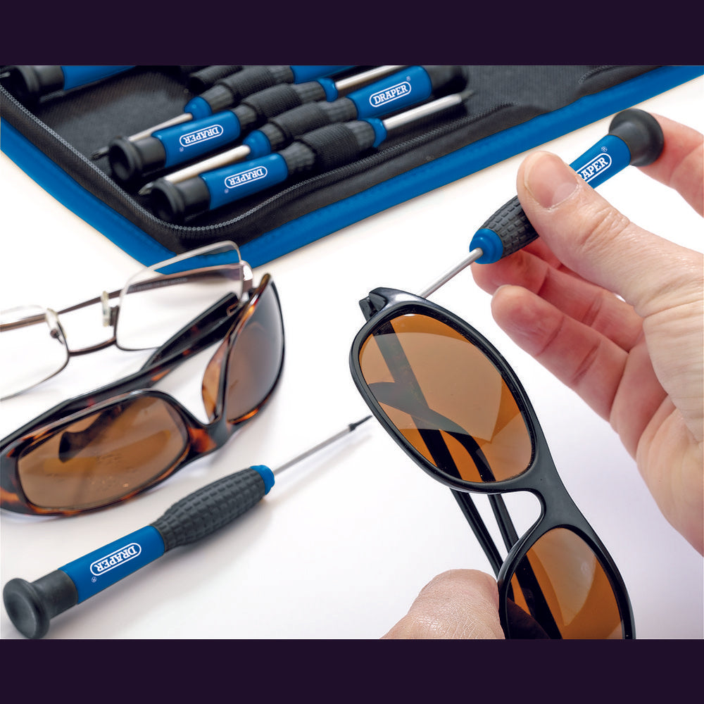 Handy combined set comprising a selection of precision pliers and screwdrivers. Pliers have forged carbon steel heads hardened and tempered with two tone handles. Screwdrivers have hardened chrome vanadium steel blades with satin chrome plated finish and black tips. Storage case with zip fastener. Multiples of eight sets only, Supplied in countertop display.