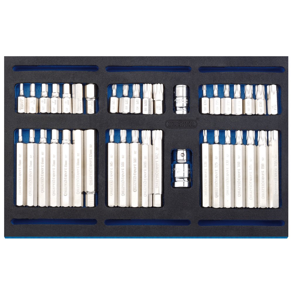 Screwdriver bits manufactured from S2 steel, which is correctly hardened and tempered with a satin chrome plated finish. Supplied complete in a two tone 1/4 drawer EVA insert tray made from closed cell foam. Suitable to be used in Draper and Draper Expert tool chests and other manufacturers similar tool chests.
