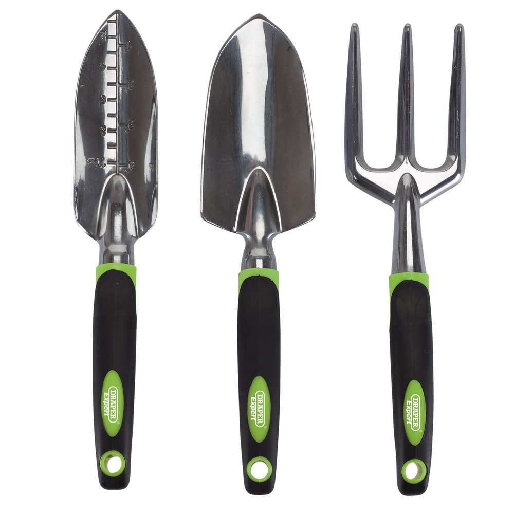 Durable garden hand tool set including a trowel, transplanting trowel and fork. All made from strong aluminium with ergonomic soft grip handles for comfort.