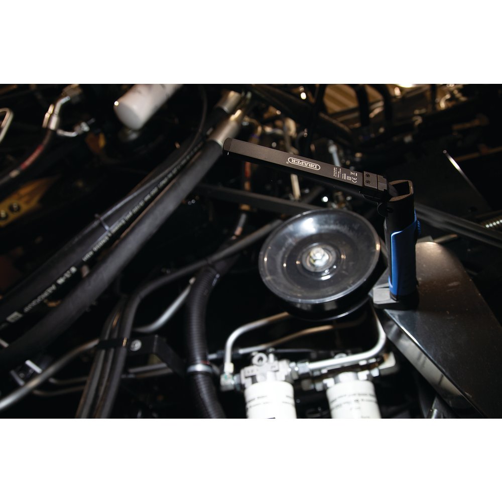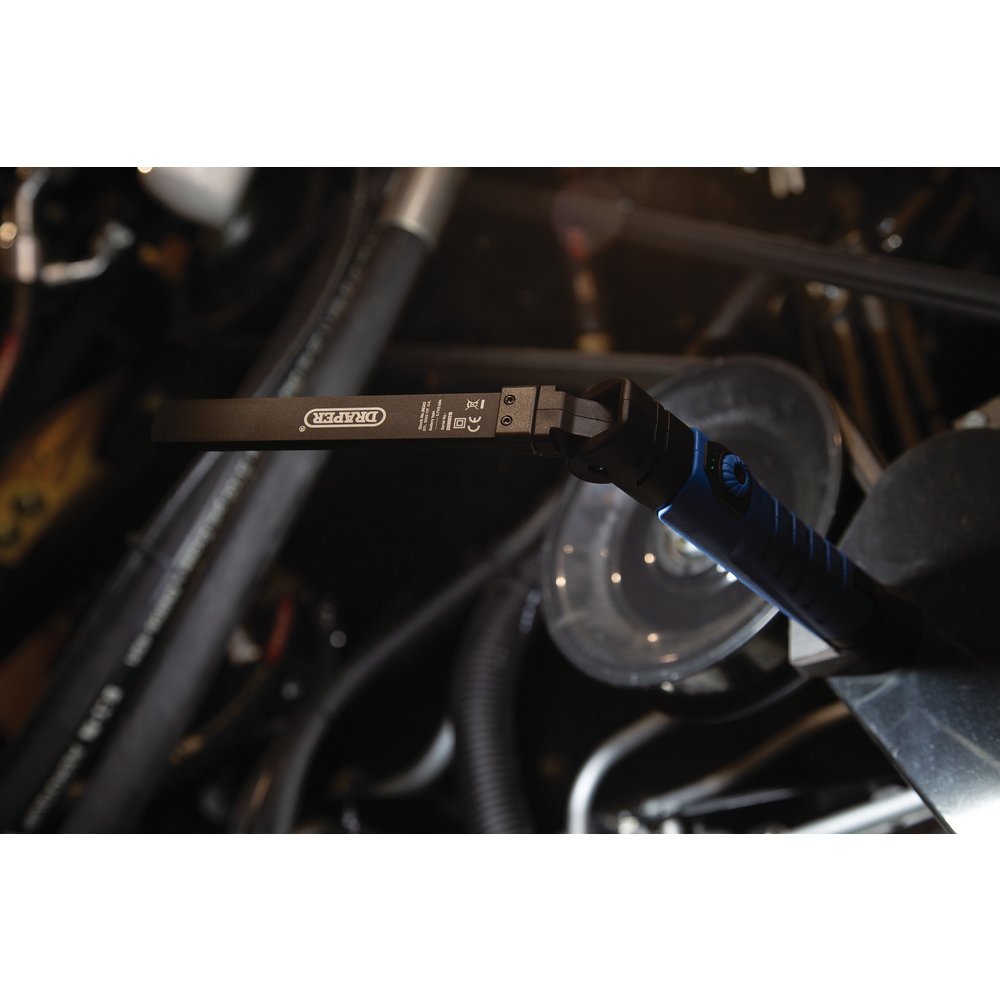 7W, COB LED inspection lamp with an SMD LED torch built into the pivoting and swivelling head allowing the light to be used in any 360° position. Fitted with a dimming function delivering a light output of between 70 and 700 lumens, a power indicator, a convenient magnetic base and a hook for hands-free use. The Micro USB charger provides up to 15 hours of continuous use with a four hour charging time.
