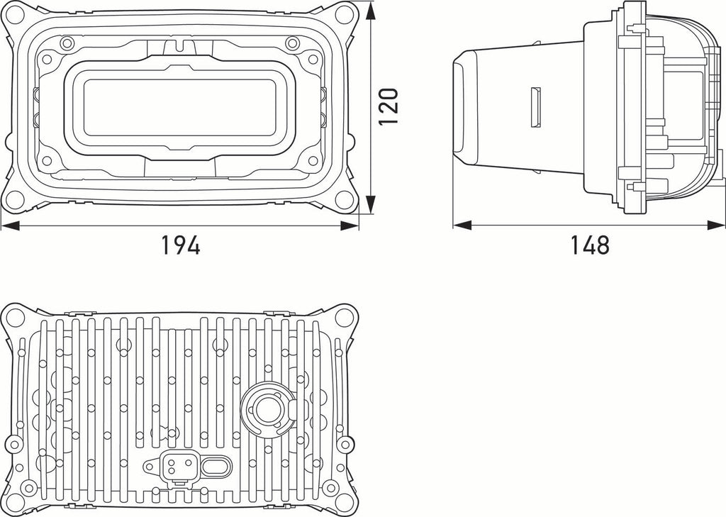 Item Attributes: Mounting Type: mountingFastening Type: Four-point attachmentLight Design: AsymmetricLamp Type: LEDVoltage: 24 V / 12 VFitting Position: right / leftHeight: 120 mmWidth: 148 mmLength: 194 mmDepth: 148 mmLight Function: with low beam (LED) / with high beam (LED)Light functions: 2Plug: DEUTSCH plugLeft-hand/Right-hand Traffic: for right-hand trafficLens Colour: Crystal clearHousing Colour: BlackShape: rectangularDiffusing Lens Material: PC (Polycarbonate)Quantity: 1Assembly by qualified personnel required!