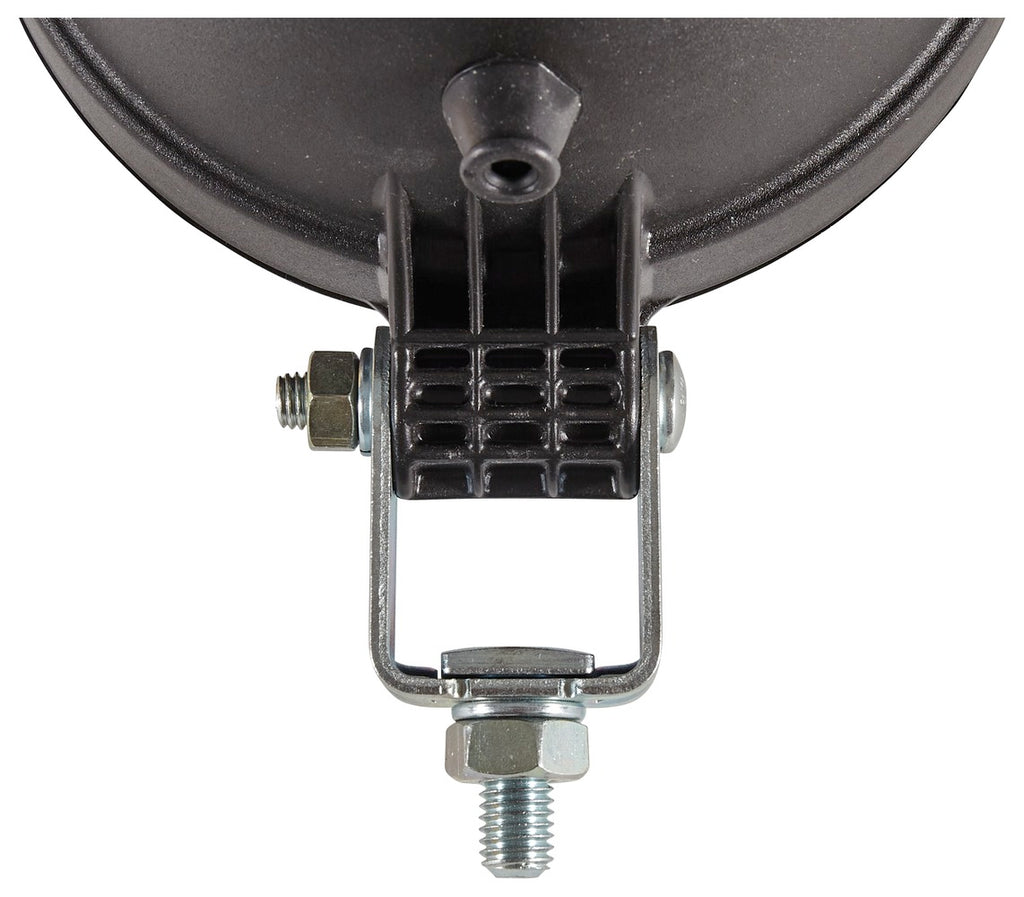 Powerful at close range or for long-range illumination. Lighting technology: Together with specially developed lens optics the parabolic reflector allows homogeneous close-range lighting of the working area or long-range illumination. An H3 bulb is used as the light source (not included with the light). As a result the worklight can be operated with both 12V and 24V vehicleelectrical systems. Design: The black housing of this worklight is made of plastic. To protect the glass lens the housing has a raised edge at the front. The Torero is suitable both for pendant and upright mounting as well as for side-mounting by turning the light insert. The cable passage for power connection runs via a grommet. Depending on the version the Torero worklight offers additional advantages such as integrated rotary switch protective grille or handle.