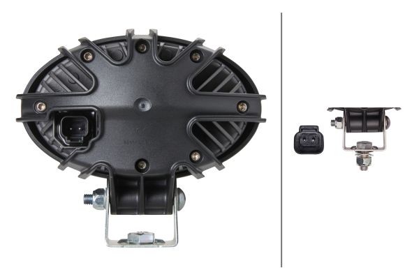 Item Attributes: Mounting Type: Screw Connection / FittingFastening Type: 2-point fasteningLight Design: LEDLamp Type: LEDVoltage: 24 V / 12 VHeight: 106 mmWidth: 166 mmDepth: 75 mmLight Distribution: Short distance lightingFulfils ECE norm.: R10Plug: DEUTSCH plugProt.type (IP Code): IP6K7 / IP6K9KLuminous Flux: 1850 lmColour Temperature: 6500 KNumber of LEDs: 6Power consumption: 26 WHousing Type: Synthetic Material HousingHousing Colour: BlackDiffusing Lens Material: PC (Polycarbonate)Diffusing Lens Type: Patterned diffusing lensAssembly by qualified personnel required!The Oval 100 LED compact is the latest version of the already extensive Oval 100 worklight series. This headlamp comes with the innovative plastic housing which offers complete corrosion resistance as well as many new mounting options. The heat-conducting plastic housing has cooling fins on the back to provide the necessary heat dissipation for the 6 high-performance LEDs. Thanks to its light output of 1850 lumens the Oval 100 LED compact is ideal for replacing old halogen worklights (H3 H9) - with a power consumption of only 26 watts. The light is distributed with a specially developed multi-facet reflector and ensures homogeneous illumination. With 6500 Kelvin the light of the LED worklight is similar to daylight. This causes colours to distinguish more clearly in the dark than in the yellowish light of halogen bulbs making it much easier for the human eye to perceive the senses and therefore prevent rapid eye fatigue. The plastic housing is hermetically sealed and thus waterproof submersible and resistant to high-pressure cleaning. The integrated electronics protect the unit in the event of reverse polarity and ensures constant brightness even with fluctuating operating voltages of 10.5 to 32 volts. Temperature sensors protect the worklight from overheating ensuring the long service life of the LEDs and safe working at night.OE references: BOMAG 05751347Worklight;HELLA;Oval 100 Compact;DEUTSCH plug;75mm;1GA 996 761-167;6;106mm;LED;12V;IP 6K8;Suspended;IP 6K9K;Plastic;6500K;Black;24V;Vertical;1850lm;800g;166mm;26W;PC (Polycarbonate);Short distance lighting;Patterned diffusing lens;Electromagnetic Compatibility (EMC);Fitting;