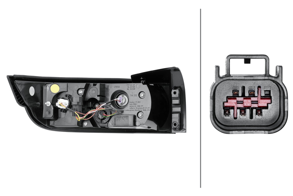 HELLA stands for competence and experience in automotive lighting, and has done so for over 100 years. HELLA offers both the trade and workshops a high-quality and comprehensive range of lighting. The independent aftermarket benefits in particular from HELLA's many years of original equipment expertise - because HELLA is one of the leading suppliers in this field with an extensive range of innovative lighting products, on whose quality products numerous car manufacturers worldwide place their trust. An OE know-how that we successfully transfer to the independent parts market. In road traffic, communication often takes place via light signals. Vehicle-specific combination rearlights from HELLA offer extra safety in road traffic. With original equipment quality and a high market coverage, we offer suitable spare parts for many vehicle types.Item Attributes: Fitting Position: rightSupplementary Article/Supplementary Info: with bulb holder / with bulbVoltage: 12 VLight functions: 6Lamp Type: W16W / LED / PSY24WLight Design: HybridLight Function: with taillight (LED) / with reflector / with side marker light (LED) / with stop light (LED) / with indicator (LED) / with reverse lightpaired article number: 2SK 010 563-211Assembly by qualified personnel required!