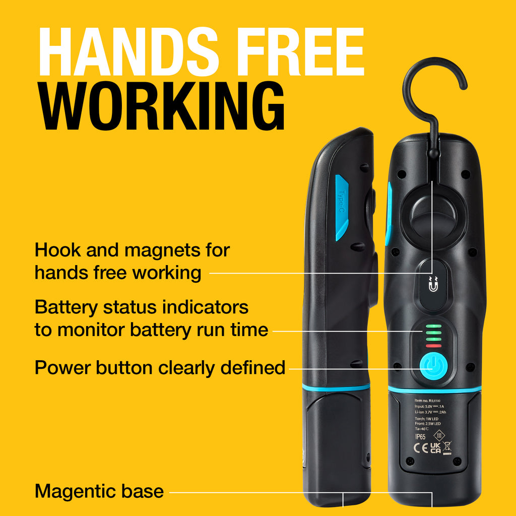 • Magnets on the back and base of the lamp as well as a rotating hook for hands free working