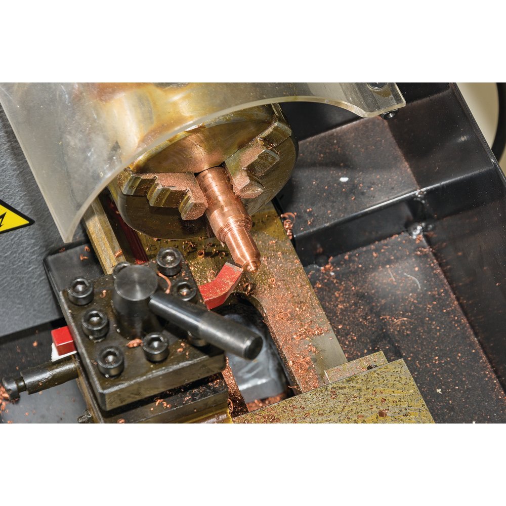 Precision built metal working lathe capable of cutting metric gears. Variable speed reversible drive and powered cutting facility for right and left hand threads. No - volt switch to prevent accidental switch on with the chuck guard fitted as standard. Supplied with self - centring three jaw chuck and approved plug. Extensive range of accessories available.