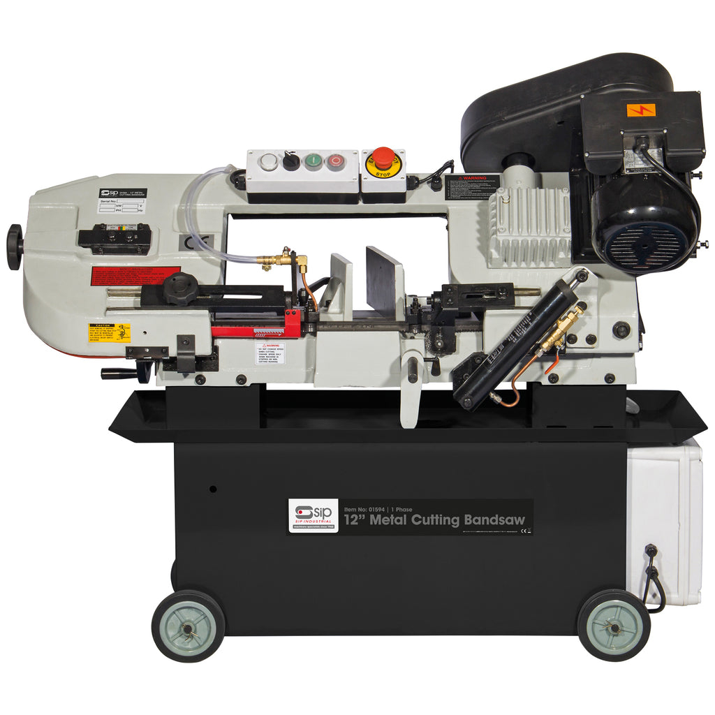The SIP 12" 230v Professional Metal Bandsaw utilises a range of heavy-duty features that ensure numerous benefits suited for trade and professional-grade applications, including a 4-speed belt-driven gearbox perfect for varying materials and thicknesses.An ultra heavy-duty cast iron bow ensures reduced vibration and increased accuracy for better cutting results and ease-of-use for the operator.This bandsaw is supplied with a bi-metal vari-pitch blade for enhanced durability, long lifespan, and excellent cutting results.• Heavy-duty single phase motor ideal for professional workshops• 4-speed belt-driven gearbox perfect for varying material types and thicknesses• Large adjustable vice ideal for large steel sections, straight, and angle cutting• Adjustable hydraulic ram dampener for smooth cutting descent, control, and increased blade performance• Integrated coolant system extends blade life and cools the cutting area• Heavy-duty cast iron bow for reduced vibration and increased accuracy• Built-in 24v control circuit safety feature for added peace-of-mind• Wheel-mounted design for easy movement in all environments• Designed for trade and professional-grade applications• Supplied with heavy-duty bi-metal vari-pitch blade• SIP 2-Year Standard Silver Warranty