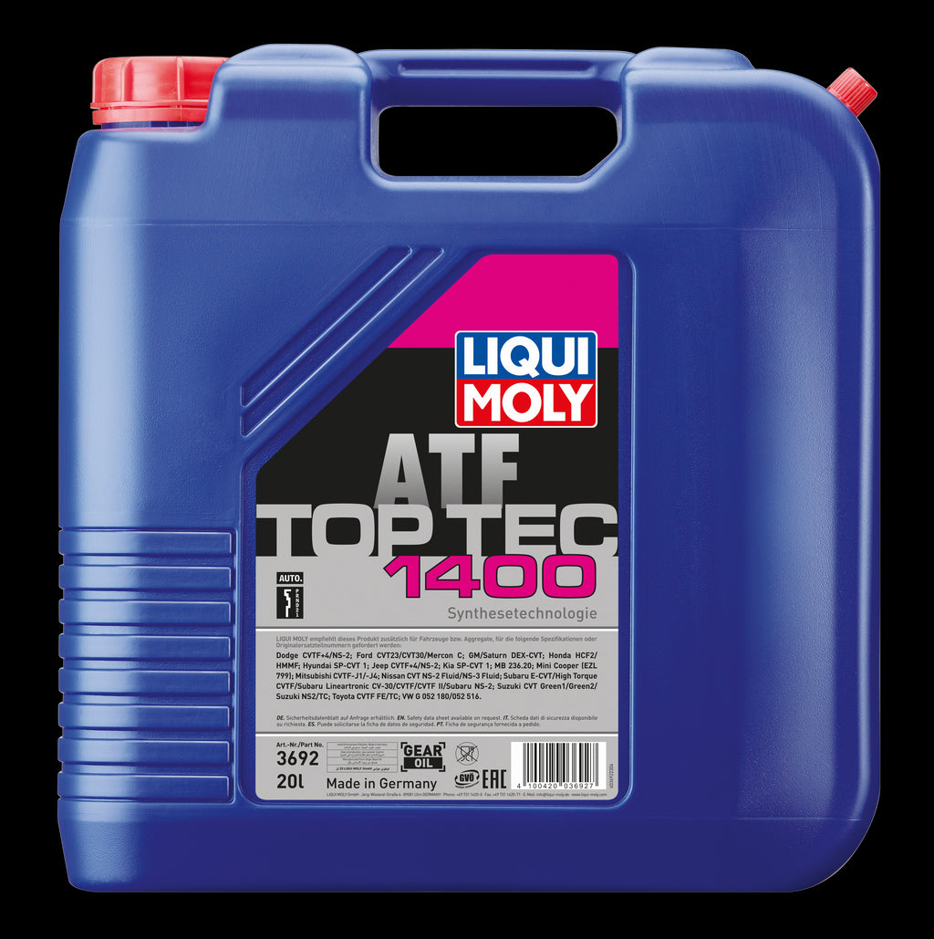 The latest generation of high-performance automatic transmission fluid based on synthetic technology. It was developed specifically for use in CVTs with thrust link belt or a gear chain made of steel. The basis of modern base oils and select additives offers the best possible anti-froth protection, which is necessary for CVTs. It also features a very good stability against aging and oxidation. Top Tec ATF 1400 is tried and tested, most notably in the Mercedes-Benz A-Class and B-Class Autotronic transmissions and in continuously variable automatic transmissions (Multitronic) in Audi vehicles.