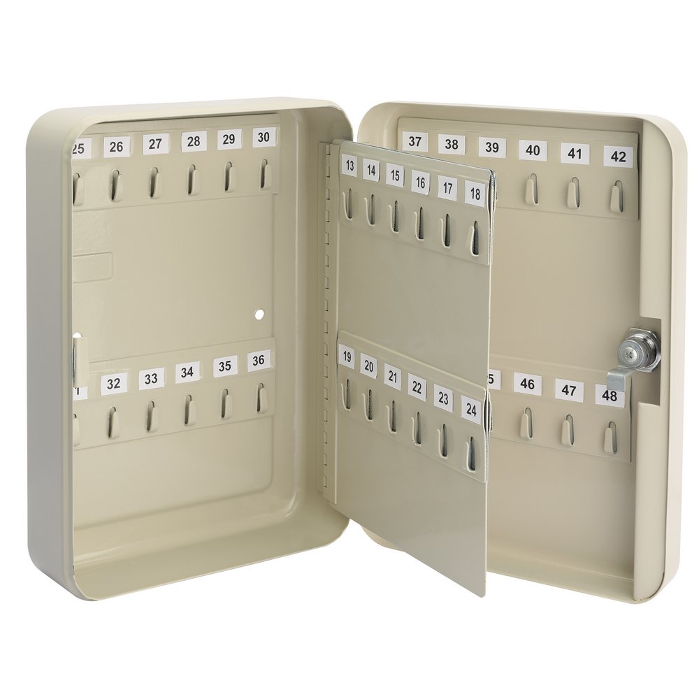 Heavy duty steel cabinet with lock for hanging up to 48 keys. Supplied with labels, wall fixings and two keys.