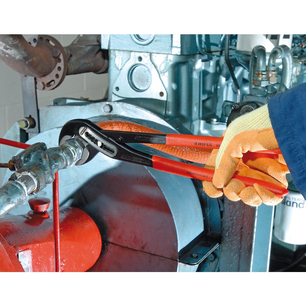 Professional Quality, manufactured from chrome vanadium electric steel, oil hardened and tempered with smoothly ground jaws, joint faces and an accurately formed box joint with safety stop. The parallelogram - shaped gripping surfaces have specially hardened teeth to 61HRC for positive grip on pipes and nuts. Plastic coated handles with slip guards for extra safety. Has 'no - nip' feature which prevents handles locking together and damaging users' hands.