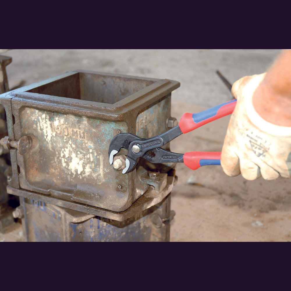 Professional Quality, manufactured from chrome vanadium electric steel, oil hardened and tempered, with smoothly ground jaws, joint faces and an accurately formed box joint with safety stop. The parallelogram - shaped gripping surfaces have specially hardened teeth to 61HRC for positive grip on pipes and nuts. One hand press button adjustment. Heavy duty moulded handles with slip guards for extra safety. Has 'no - nip' feature which prevents handles locking together and damaging users' hands.