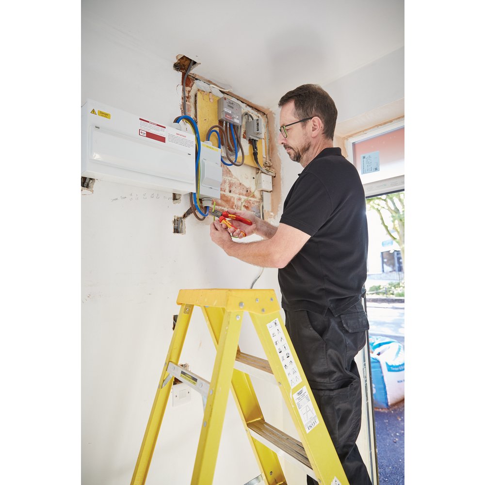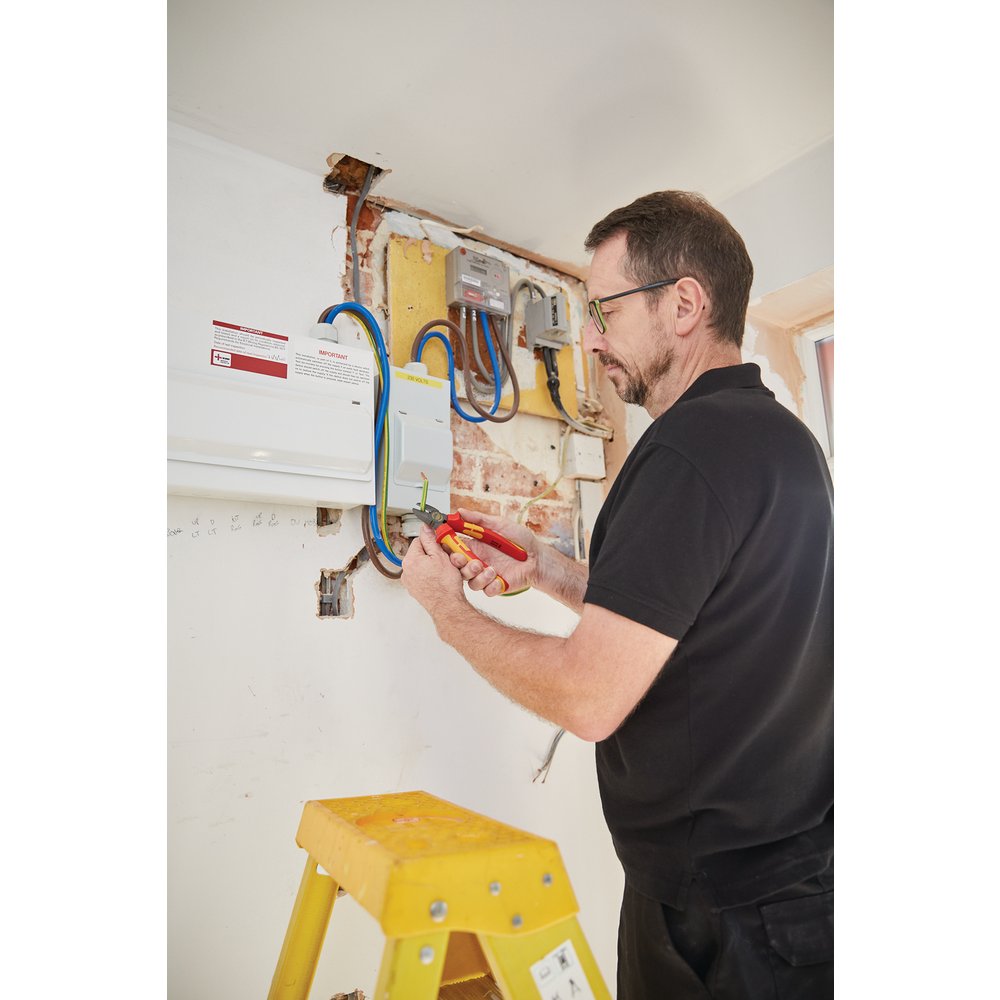 Expert quality XP1000®, manufactured from premium steel forged in Germany. Induction-hardened jaws provide better gripping performance and an effortless clean cutting edge. The precision-machined pivot pins allow smooth one-handed operation with minimum play for ease of use. A two-part bi-material ergonomic soft grip handle allows maximum grip and user comfort, and horns prevent slipping onto live conductors. Tested to 10,000V, these pliers are suitable for working on live circuits of 1,000V AC and 1,500V DC. The handle also incorporates a tethered fixing solution to comply with Work at Height Regulations (lanyard Stock No. 82474 and wrist strap Stock No. 03470 sold separately). Maximum cutting capacity: 1.8mm.