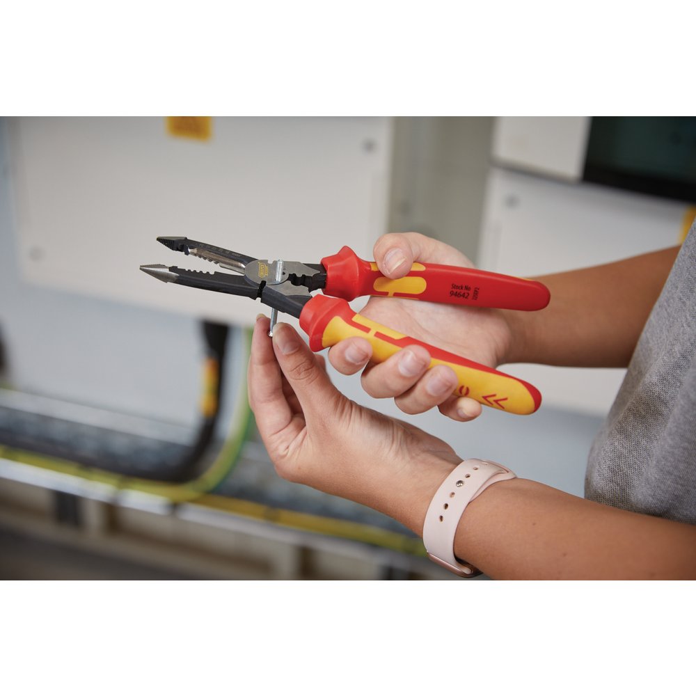 Expert quality XP1000®, manufactured from premium steel. Featuring many features in one tool for the electrician on site, including features for cutting cables, wire stripping notches (0.75–4.0mm) terminal crimping (0.75, 1.0, 1.5, 2.5, 4.0mm), pattress screws shearing 3.5mm and 4.0mm panel screws. Long nose for grabbing and looping wires. A two-part bi-material ergonomic soft grip handle allows maximum grip and user comfort, and horns prevent slipping onto live conductors. Tested to 10,000V, these pliers are suitable for working on live circuits of 1,000V AC and 1,500V DC.