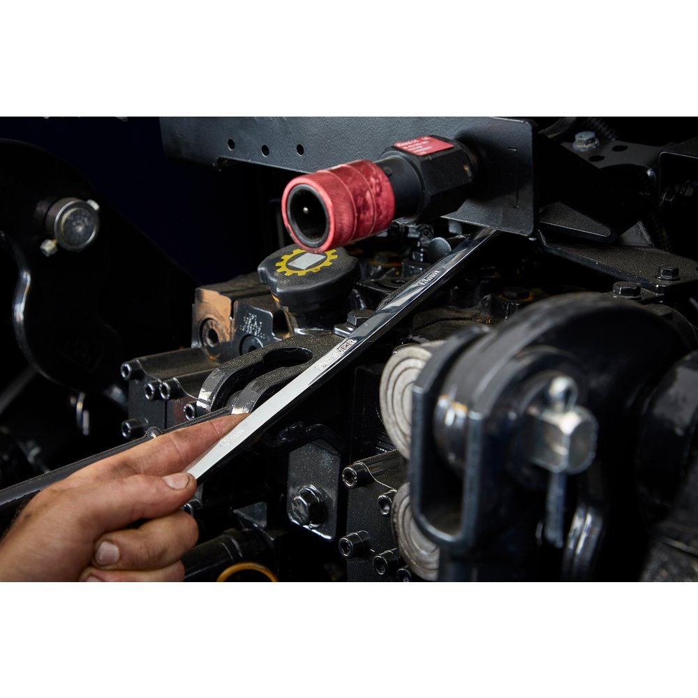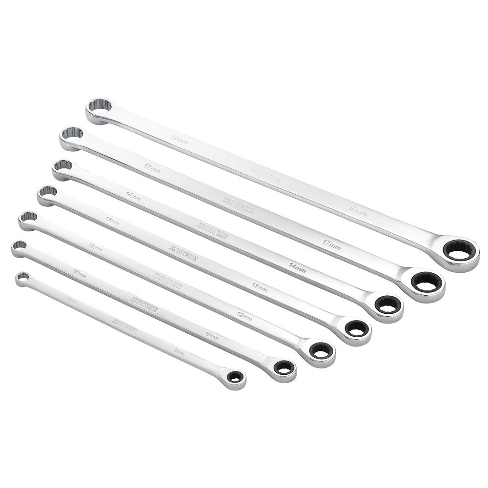 These Draper HI-TORQ® metric extra-long double ring ratchet and fixed end spanners are forged from chrome vanadium steel that is hardened, tempered, fully polished and mirror chrome plated for corrosion protection. The extra length provides better access to hard-to-reach spaces, while the 90-tooth ratchet mechanism gives 4° movement enabling use in tight spaces. Both ring ends are 12-point HI-TORQ®, which delivers maximum leverage by transferring torque to the flats and prevents slipping or damage to the fastener. The seven-piece set contains popular sizes. Supplied in a Tetron wallet.