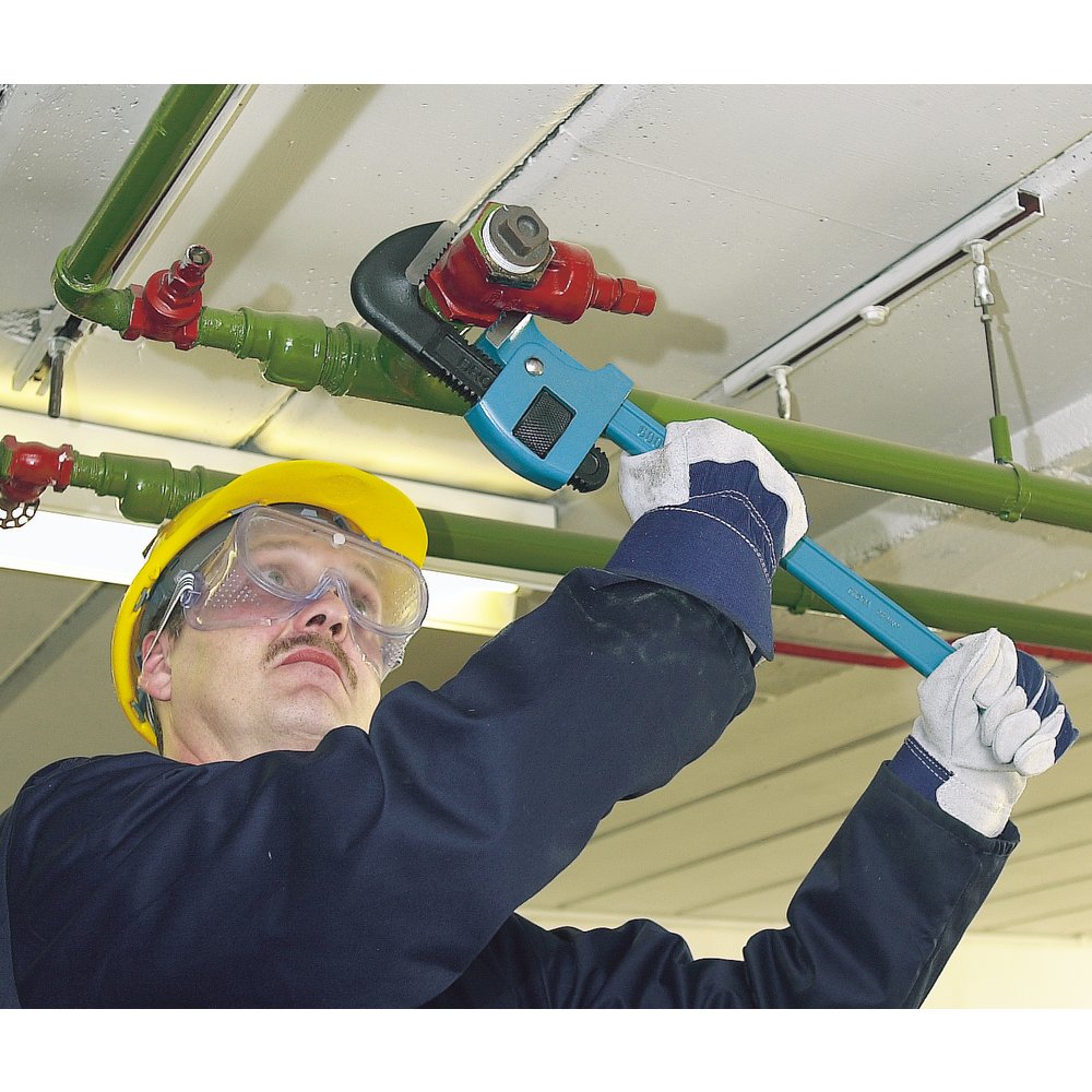 Professional Quality, manufactured from tool steel, hardened and tempered. The spring - loaded induction hardened jaws have wide faces serrated in opposite direction to ensure a secure grip. Polished head with blue lacquered handle.